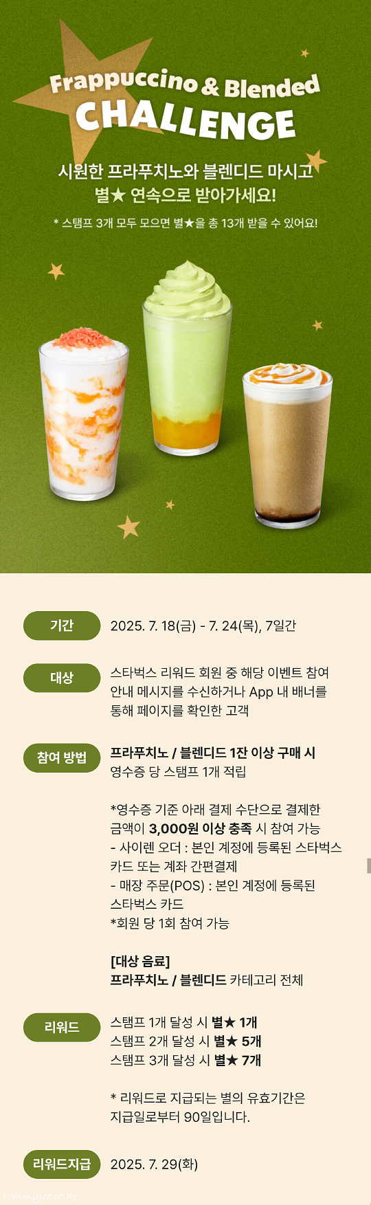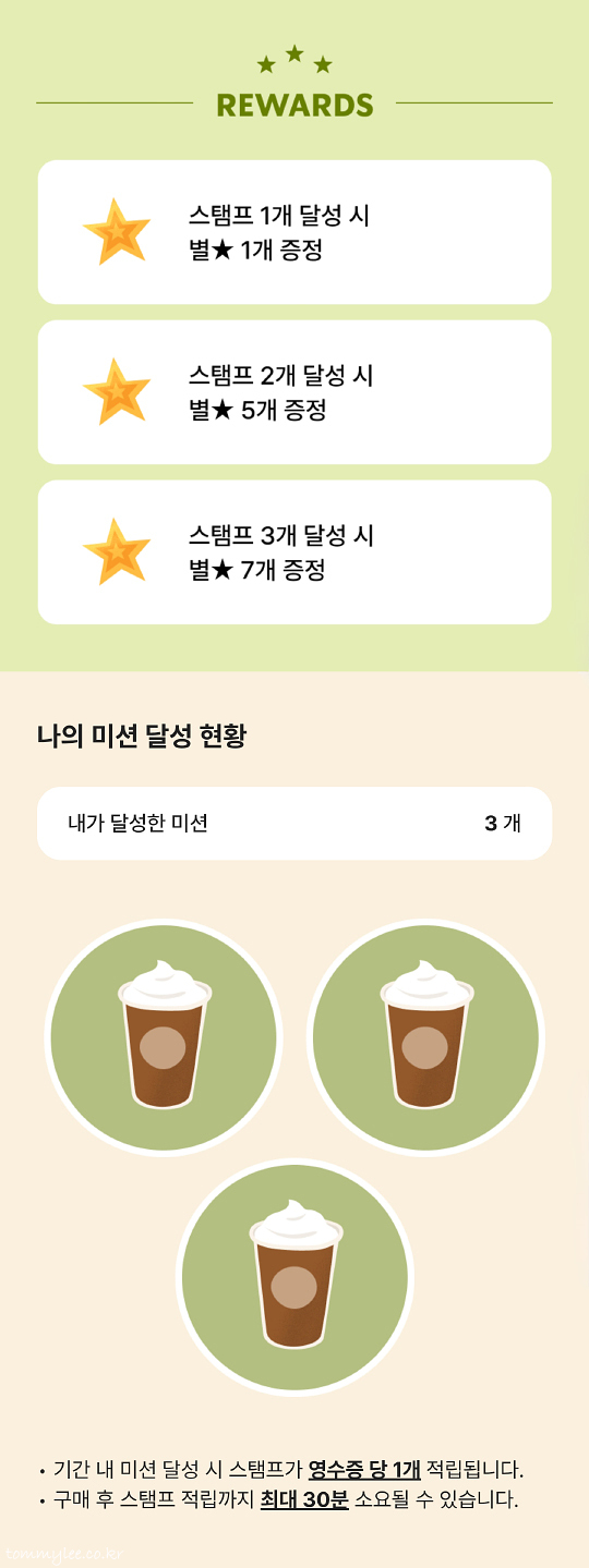 시원한 프라푸치노와 블렌디드 마시고 별★ 연속으로 받아 가세요.. 스탬프 1개 별 1개, 스탬프 2개 별 5개, 스탬프 3개 달성 시 별 7개.. 총 13개의 별을 받을 수 있는 좋은 이벤트.. 이런 건 누구나 참여할 수 있는 이벤트는 아니고, 스타벅스가 주고 싶은 사람한테만 주는 비밀스러운 이벤트.. 대상자 선정 기준은 모르겠는데 오는 사람만 오긴 합니다.. ㅡㅡ;;..