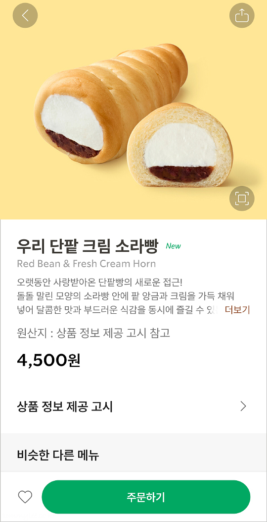 소라빵 안을 생크림과 단팥소로 채운 스타벅스 베이커리 신메뉴.. 우리 찹쌀 꽈배기와 우리 팥 찹쌀 도넛에 이은 한국의 맛 시리즈로 출시된 것 같네요..