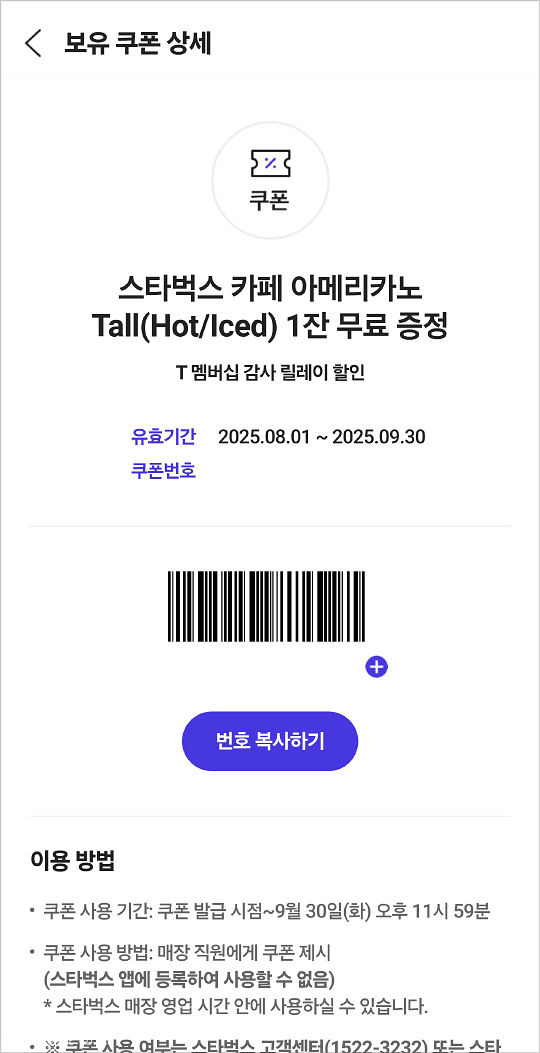 T멤버십 앱 행사 페이지에서 쿠폰 다운로드를 누르면.. '혜택 쿠폰함'이라는 곳이 위와 같은 쿠폰이 지급이 되는데요.. 이 쿠폰 바코드 화면을 스타벅스 매장에서 직원에게 제시하시면 되는 내용입니다.. 쿠폰 다운로드가 오늘까지니 주의를..