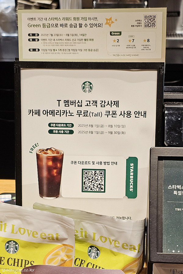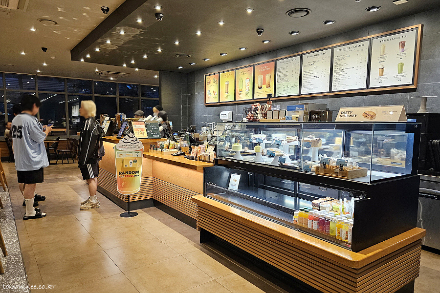 동교 스타벅스 매장 안으로 들어서면 이런 느낌.. T멤버십 고객감사제 쿠폰은 사이렌오더로는 사용할 수 없고.. 매장 포스로만 주문가능하답니다..
