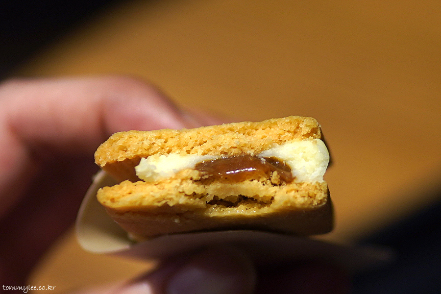 먹어보니 센터부분 안쪽에 이렇게 밀크 캐러멜이 숨어 있습니다.. 버터 풍미가 생각보다 덜 나긴 했는데 맛은 나름 있었어요.. 중간에 카라멜 터지는 것도 좋고..