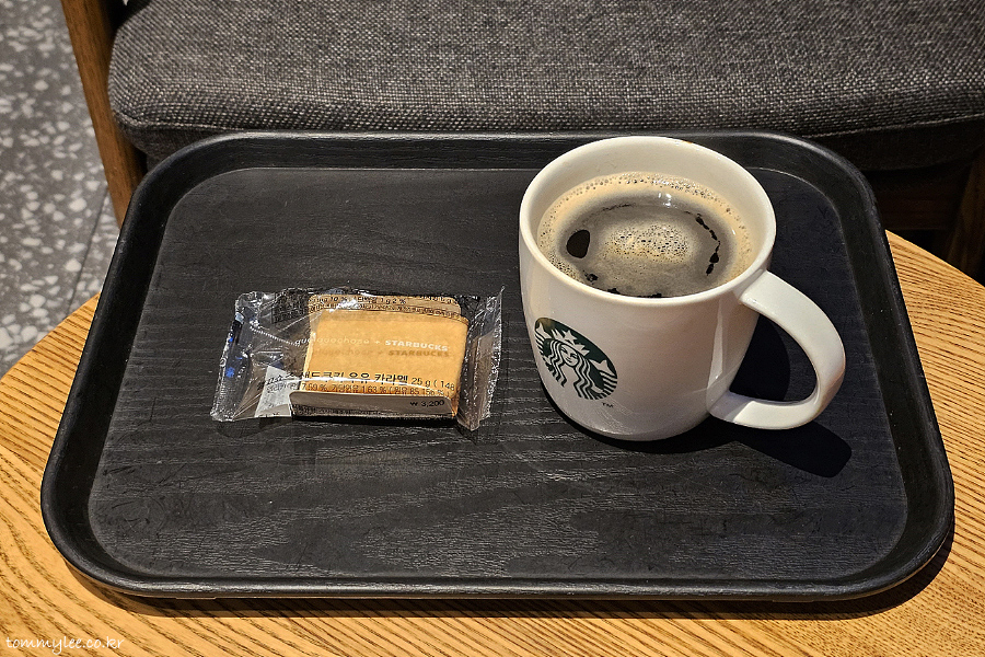 T멤버십 감사제 쿠폰으로 톨 카페 아메리카노와 함께 신제품 깰끄쇼즈 샌드쿠키 밀크카라멜을 페어링 해봤습니다..