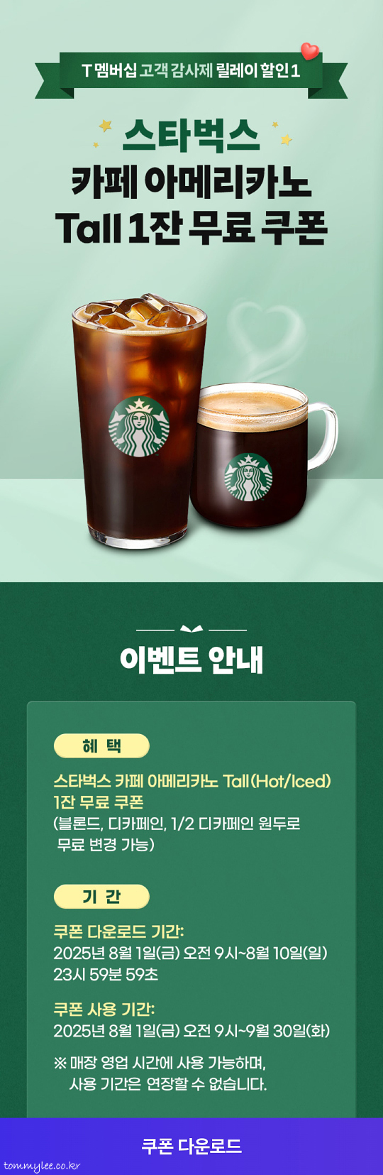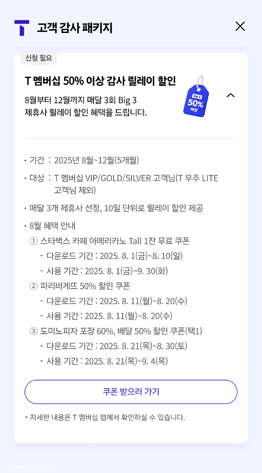 T고객 감사 패키지 내용은.. T멤버십 50% 이상 감사 릴레이 할인.. 매달 3회 빅3 제휴사 릴레이 할인.. 8월은 스타벅스 카페 아메리카노 무료, 파리바게뜨 50%할인 쿠폰, 도미노피자 포장 60%, 배달 50% 할인입니다.. T멤버십 앱이 있어야 하고, 다운로드 기간 내에 쿠폰을 받으셔야 합니다..
