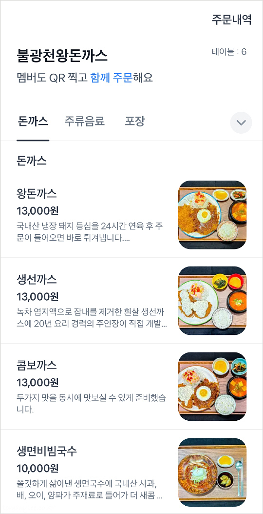 불광천왕돈까스 메뉴 및 가격.. 왕돈까스 13,000원, 생선까스 13,000원, 콤보까스 13,000원, 생면비빔국수 10,000원.. 테이블에 붙어 있는 QR코드에 휴대폰 카메라를 가져다 대면 이렇게 불광천왕돈까스 메뉴가 뜨고요.. 바로 주문하실 수 있답니다..