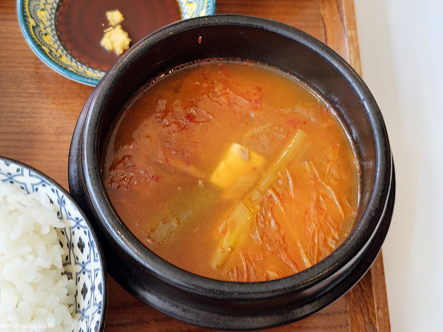 보통 이런 돈까스집엔 크림수프가 나오지만, 불광천왕돈까스는 김치찌개가 제공.. 그것도 무려 뚝배기 김치찌개..