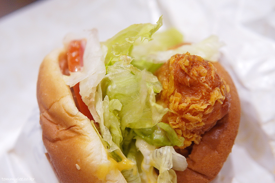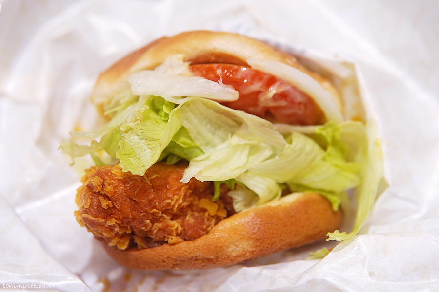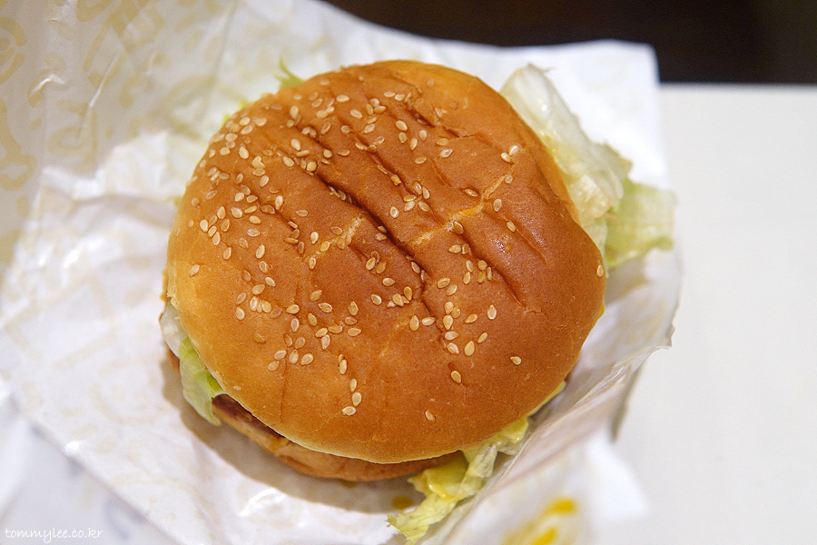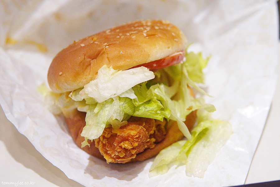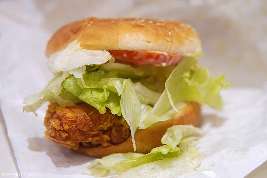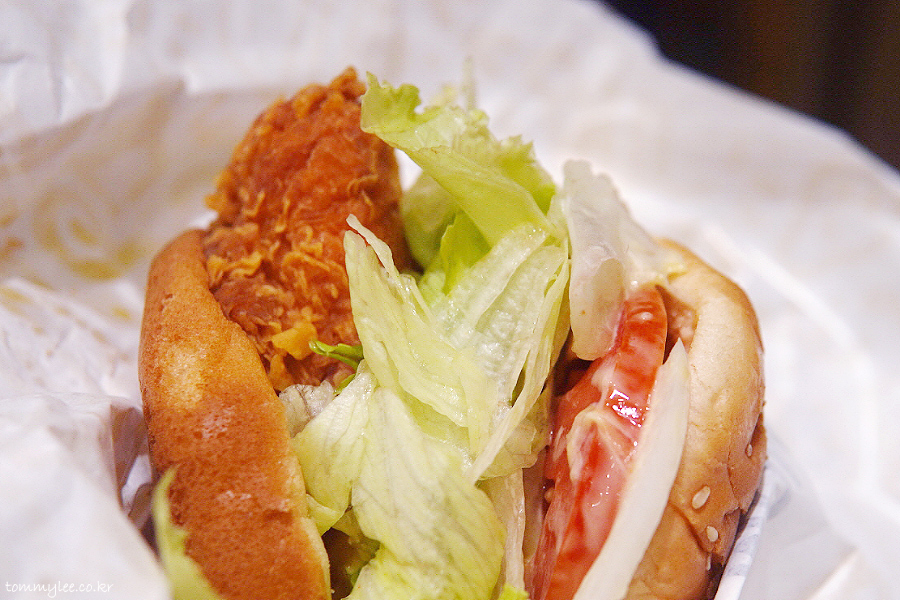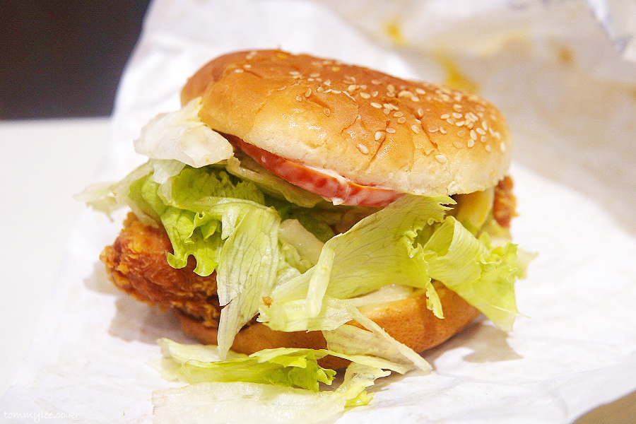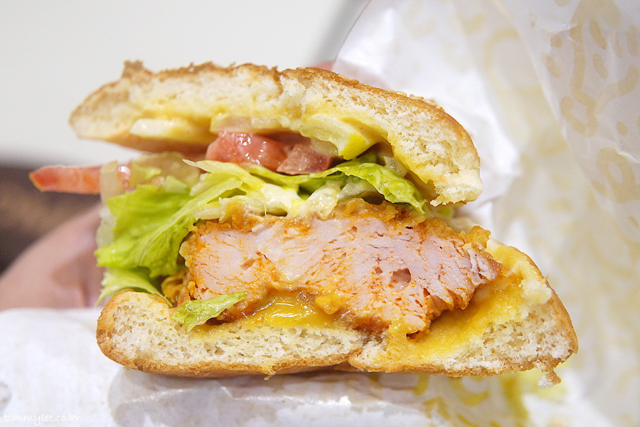 커팅하기가 매우 힘들었지만 억지로 반을 갈라봤습니다.. 치킨 패티가 엄청 두툼.. 한 입 먹으면 입 안이 그냥 꽉 차는 느낌이 들고요..