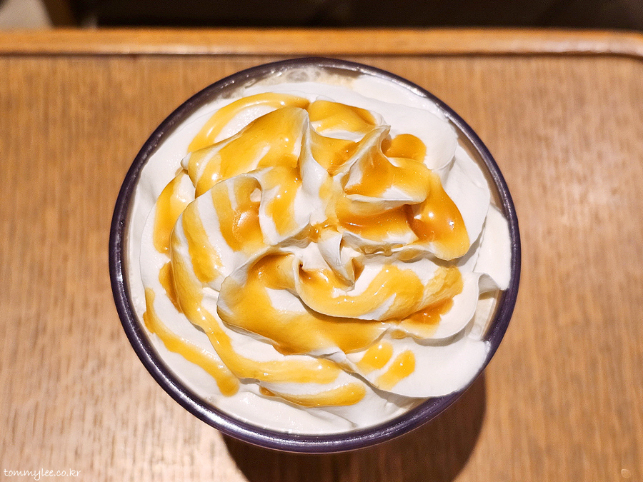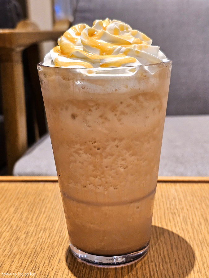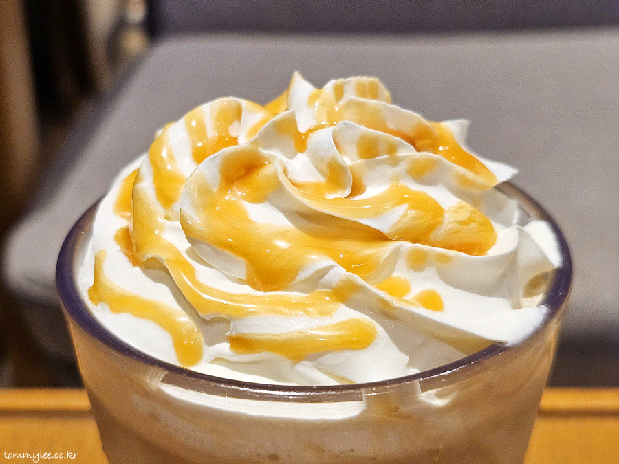 보통의 프라푸치노보다 휘핑크림이 적게 올라가서 커스텀 주문 해줘야 합니다.. 휘핑크림 많이 카라멜 드리즐 많이로 하면 이렇게 나와요.. ㅋㅋㅋ..