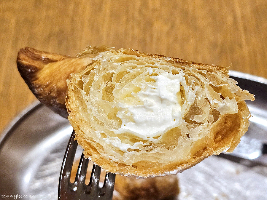크루아상 끝쪽까지 이렇게 크림이 들어가 있었답니다.. 마스카포네 크림치즈에 생크림을 블렌드 했는데요.. 보기보단 생지에 버터향 풀풀 나고 크림도 충실하니 꽤 맛있네요..