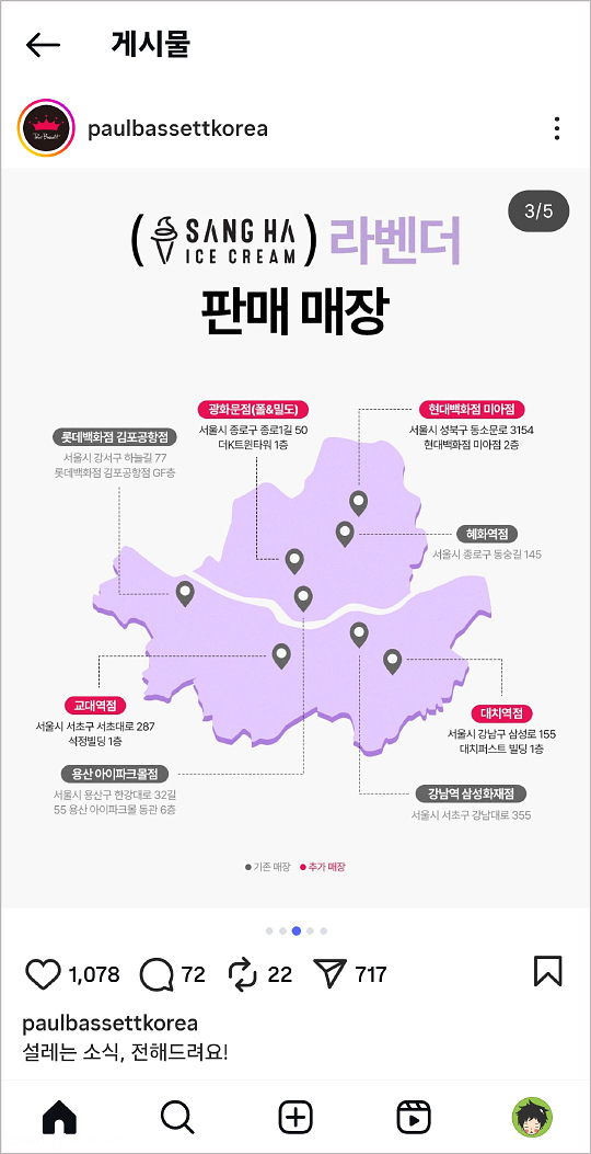 인서울 폴바셋 라벤더 아이스크림 판매 매장입니다.. 기존에는 용산아이파크몰점, 강남역삼성화재점, 롯데백화점김포공항점 한정 판매였는데.. 추가적으로 광화문점, 현대백화점미아점, 교대역점, 대치역점에 출시한다는 내용.. 잘못 봤나 싶어 확인해 봐도 분명 롯데몰은평점은 없는데 이게 웬이루??..
