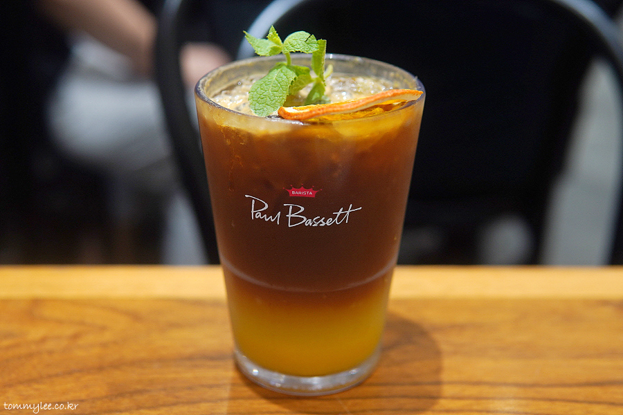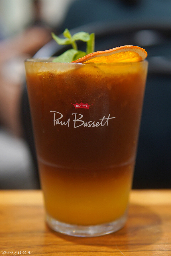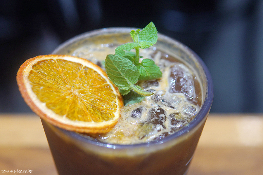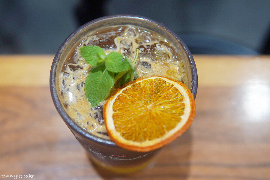오렌지 주스에 토닉 워터와 에스프레소가 들어간 느낌이라고 보시면 될 거 같네요.. 프레시한 느낌 나름 있고요.. 건조 오렌지 슬라이스와 애플민트 잎으로 장식..