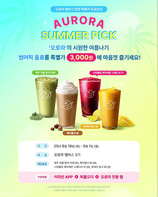 AURORA SUMMER PICK.. 오로라의 시원한 여름나기.. 썸머픽 음료를 특별가 3,000원에 마음껏 즐기세요~.. 대상 메뉴는 제주첫물말차라떼, 스파클링제주레몬스웨디쉬티, 헤이즐넛아이스블렌디드, 후레쉬망고아이스블렌디드 4종이고요.. 가장 저렴한 스파클링제주레몬스웨디쉬티가 6,900원인데 이걸 3,000원에 준다는 거니까.. 56% 이상의 훈훈한 할인율로 보시면 되겠네요..