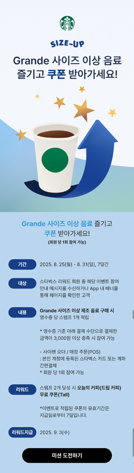 그란데, 벤티 사이즈 음료 아무거나 2번 주문하면 끝나는 아주 쉬운 이벤트.. 미션 스탬프 2개 달성 시 오늘의 커피 무료 쿠폰 증정..