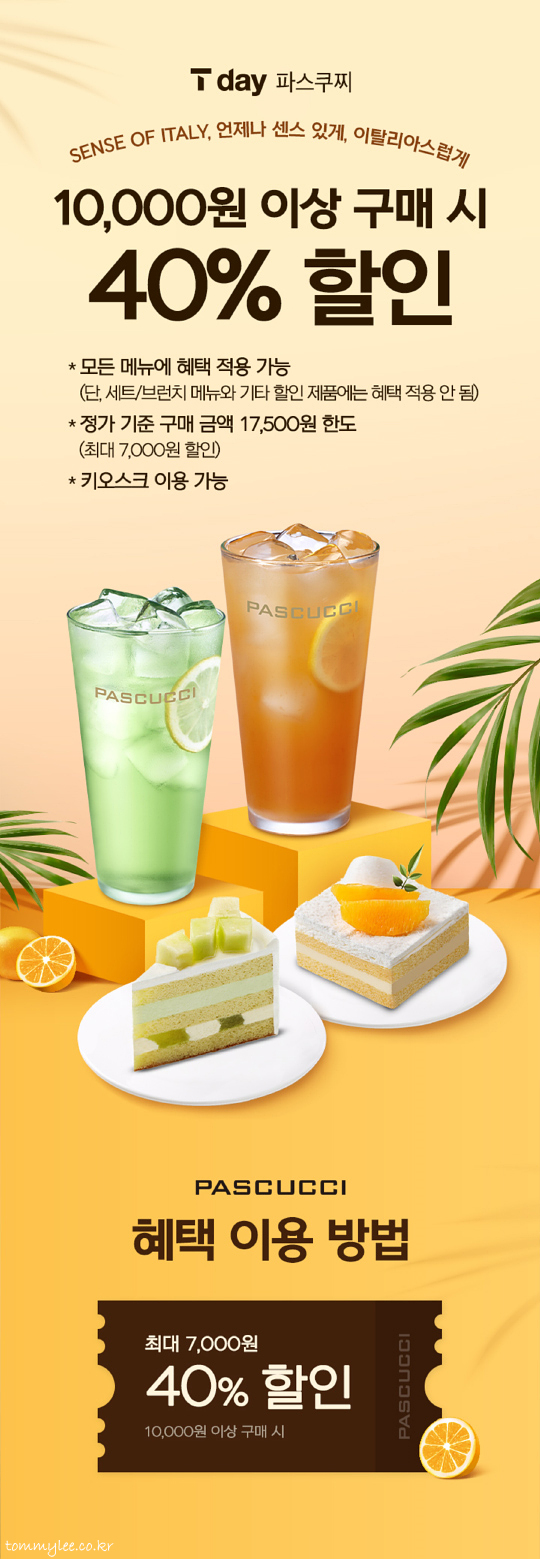 T멤버십 T데이 파스쿠찌.. SENSE OF ITALY, 언제나 센스 있게, 이탈리아스럽게.. T데이 8월 혜택은 만원 이상 구매 시 40% 할인.. 최대 7천원 할인이라 쏠쏠하답니다..