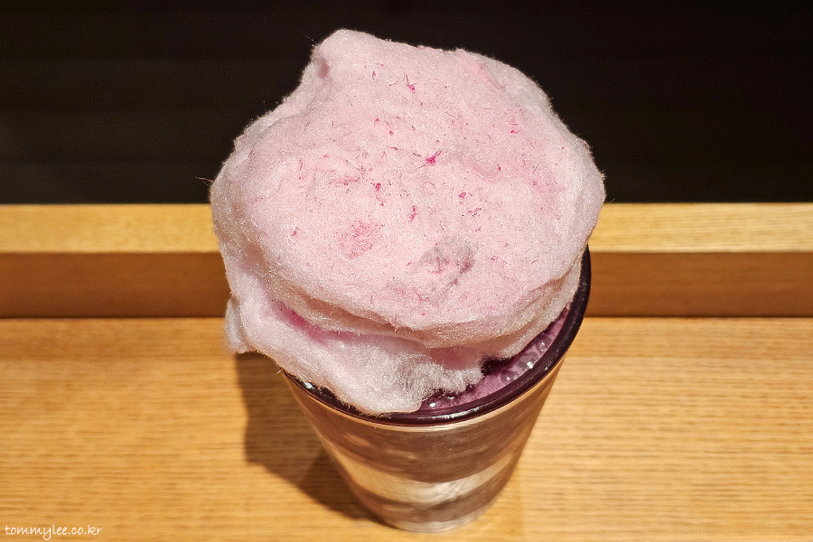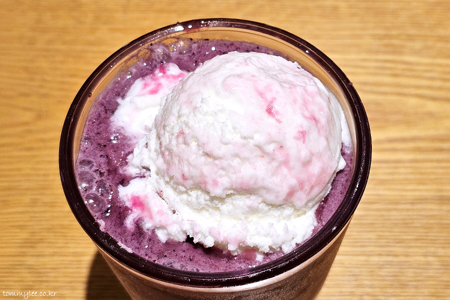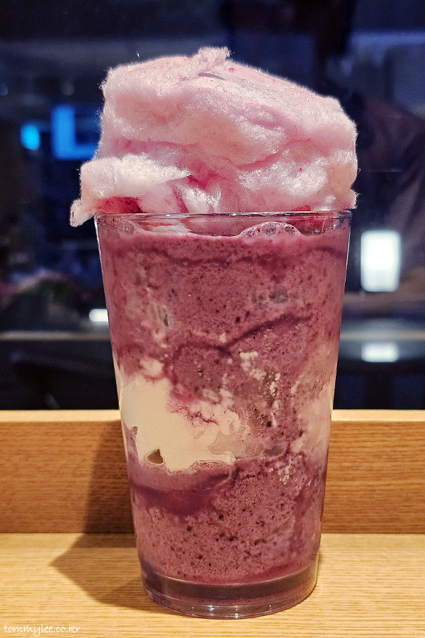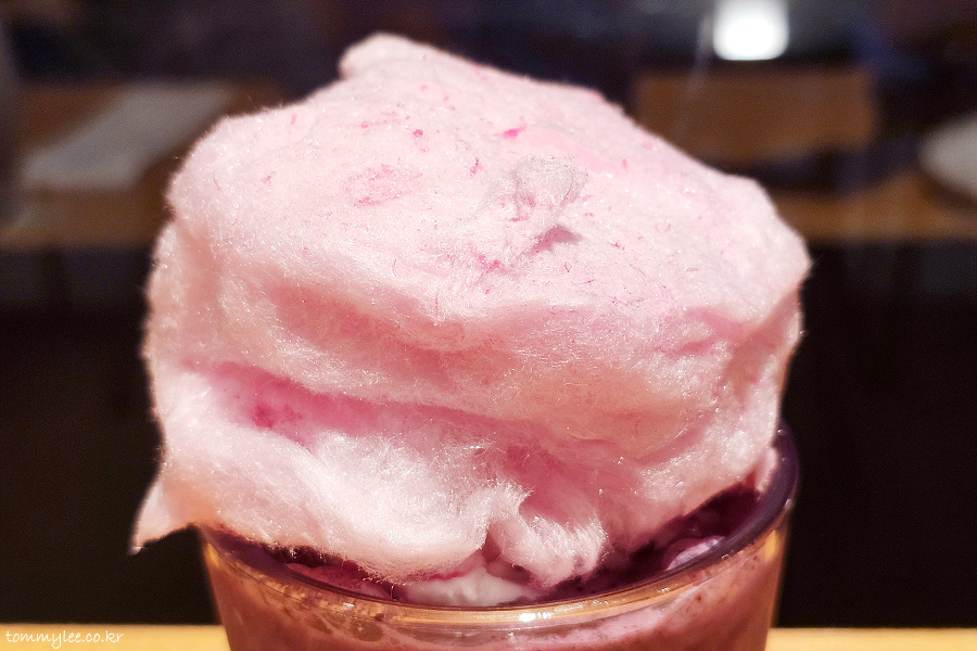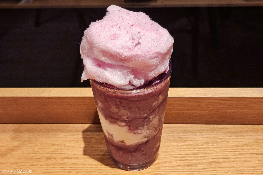 블루베리랑 요거트, 얼음을 블렌더에서 갈고.. 중간에 휘핑크림으로 레이어 주고.. 요거트 젤라또와 핑크 솜사탕을 토핑 했다고 보시면 되겠고요..