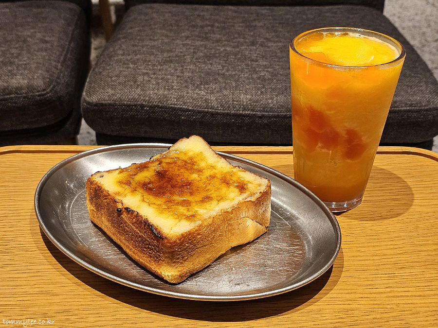 운 좋게 오늘은 크렘브륄레 토스트를 만날 수 있겠네요.. 프레시 베이커리 매장에서만 만날 수 있는 크렘브륄레 토스트에 제주 탄제린 블렌디드 조합이 성사되었단..