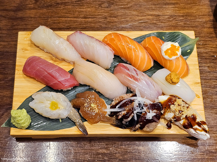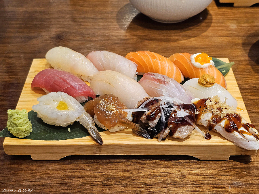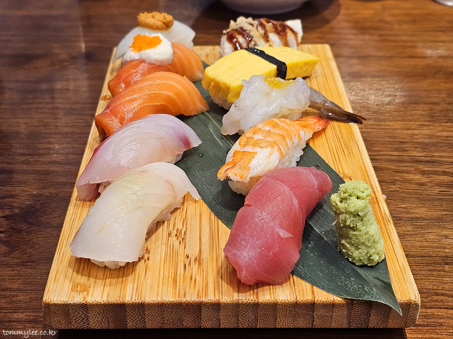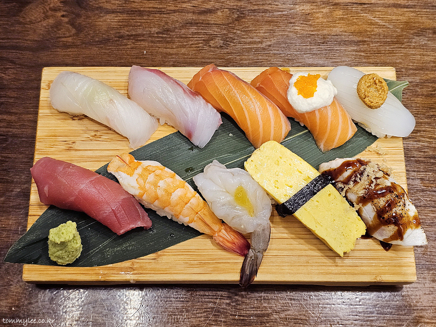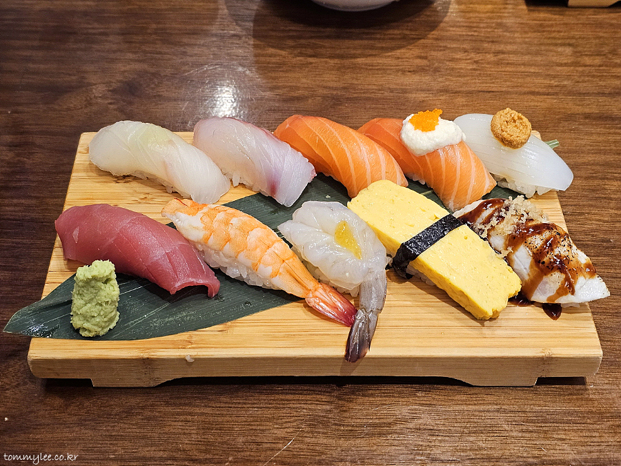 지인분들의 선택은 12관이 나오는 특선초밥입니다.. 모듬과는 달리 얘는 초밥이 3줄로 나오네요.. 판초밥 메뉴들 중에서도 이 특선이 가장 가성비가 좋다고 하네요.. 메뉴 제공 시간은 15분 내외로 보시면 될 것 같아요.. 그나저나 사장님이 직접 도마를 들고 주방에서 나오셔서 서빙해 주심.. 감시하러 나오셨나 싶기도.. ㅋㅋㅋ..