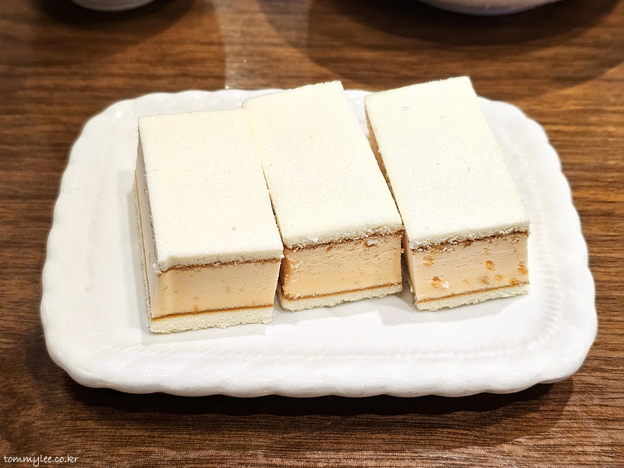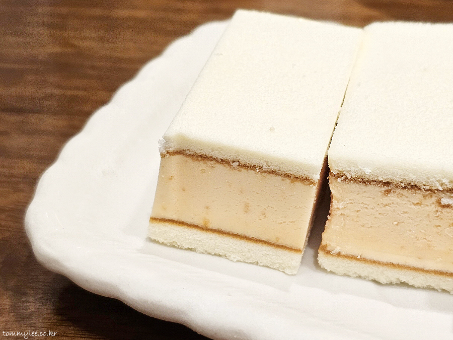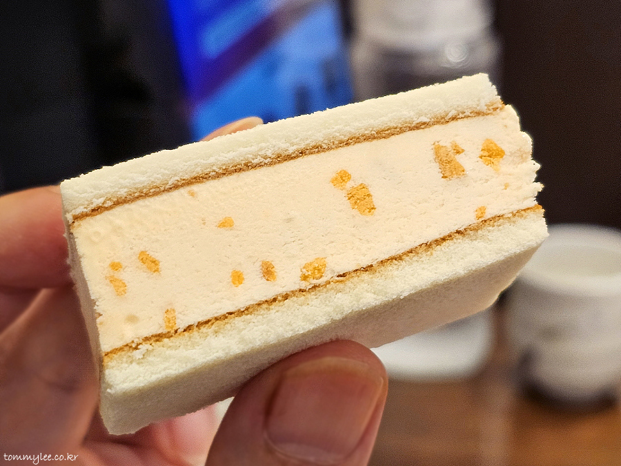 얇고 보들한 카스테라 생지 사이에 황치즈 아이스크림이 샌드 된 형태..