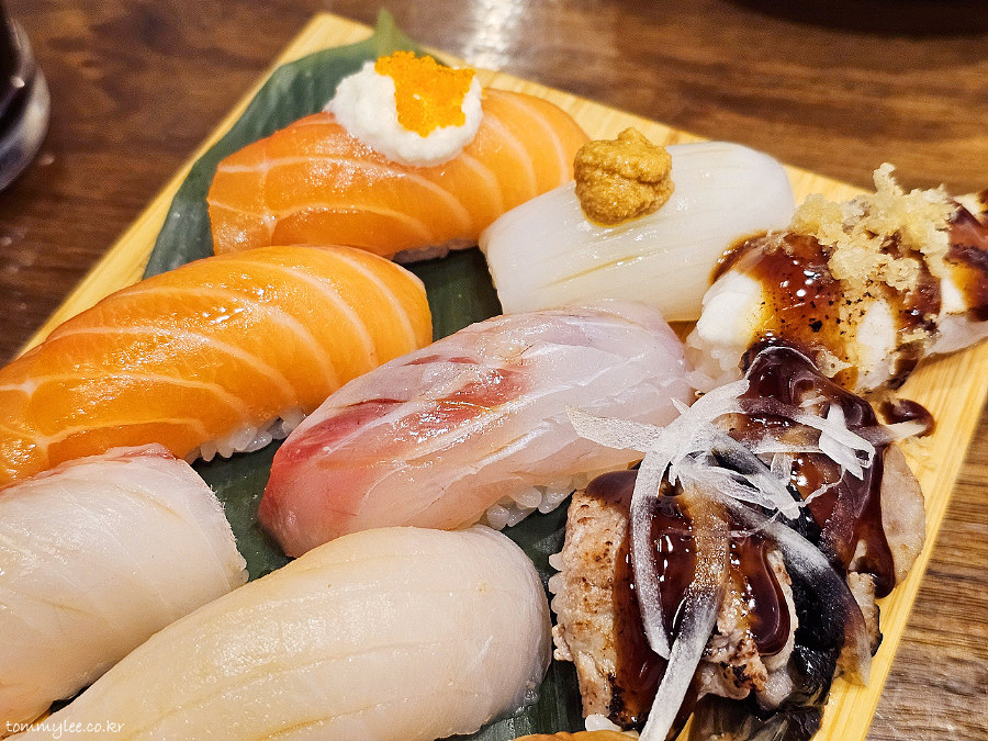원목 스시도마에 대나무 이파리까지 깔아서 정중하게 제공.. 메뉴 담은새에서부터 경쟁업체랑 차이가 많이 났어요.. ㅠ.ㅠ.. 광어, 도미, 아카미, 초새우, 생새우 순인데요.. 네타가 도톰하고 사이즈도 큰 편.. 생새우 초밥에서 유자 제스트 향이 풀풀 나서 깜놀함..