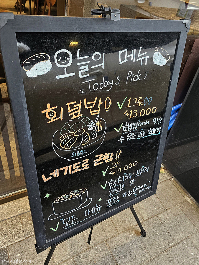오늘의 메뉴.. 회덮밥 13,000원, 네기도로 군함 7,000원.. 모든 메뉴 포장 가능..