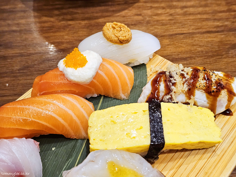 연어2, 갑오징어, 계란, 생선스테이크 순입니다.. 연어초밥은 2관이 나오는데.. 화이트소스 날치알 토핑을 올려 어렌지를 해서 같은 연어초밥이지만 다른 느낌을 주는 센스.. 갑오징어 초밥에 우니를 올려주는 건 반칙 아닌가 싶었음.. ㅋㅋㅋ..