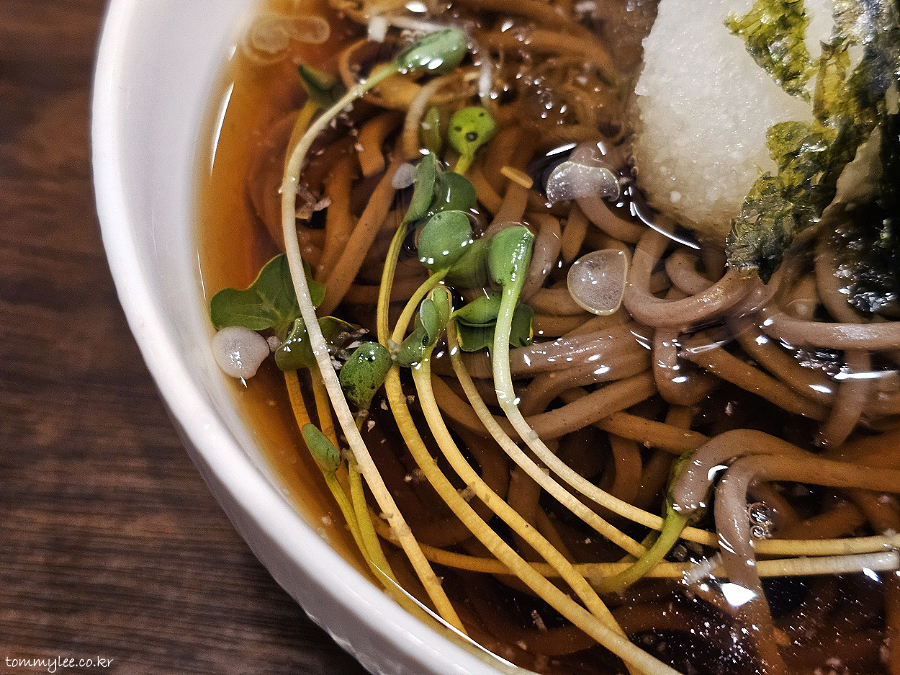 히야시 소바인데 무즙이랑 김가루, 무순과 파 토핑이 곁들여져 있습니다..