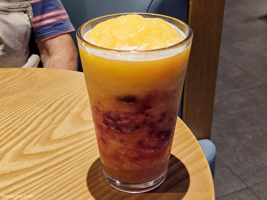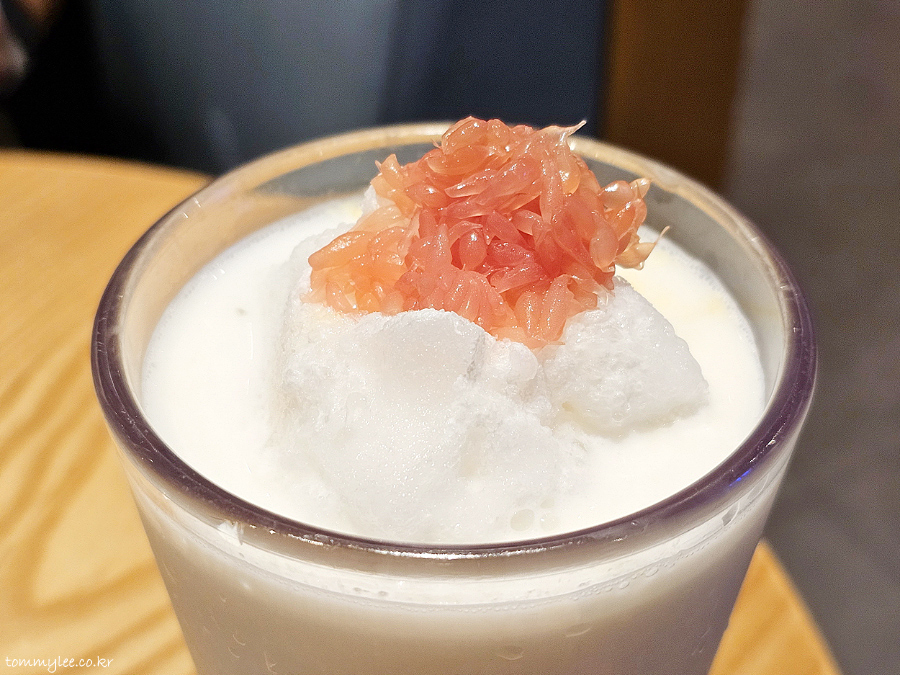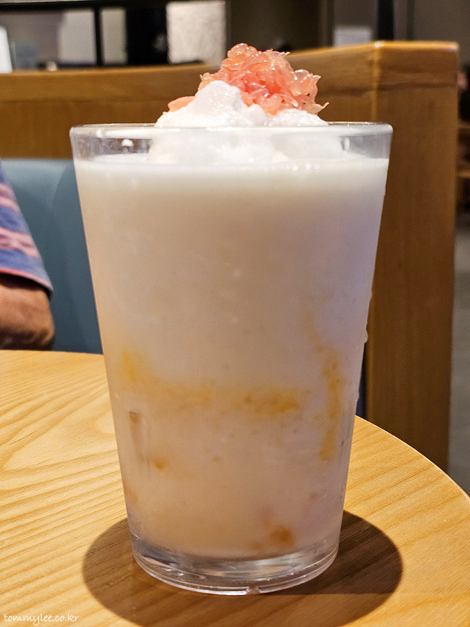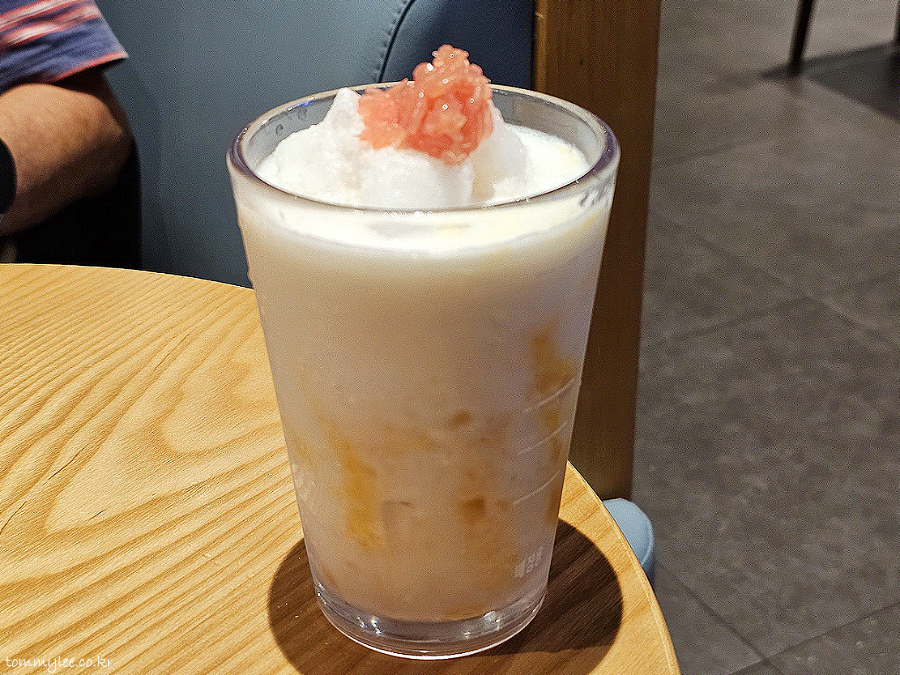 코코넛 베이스에 자몽망고 소스 조합인데.. 코코넛 젤리가 은근 많이 들어 있어서 씹어 먹는 맛도 있고 해서 좋다고.. 자몽과 망고가 의외로 잘 어울리는 조합이라는 사실을 느낄 수 있답니다..