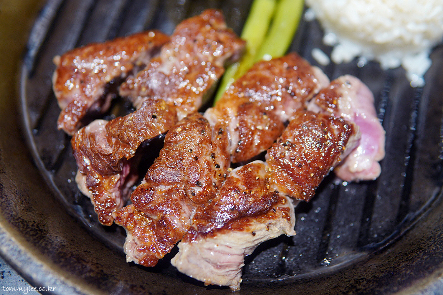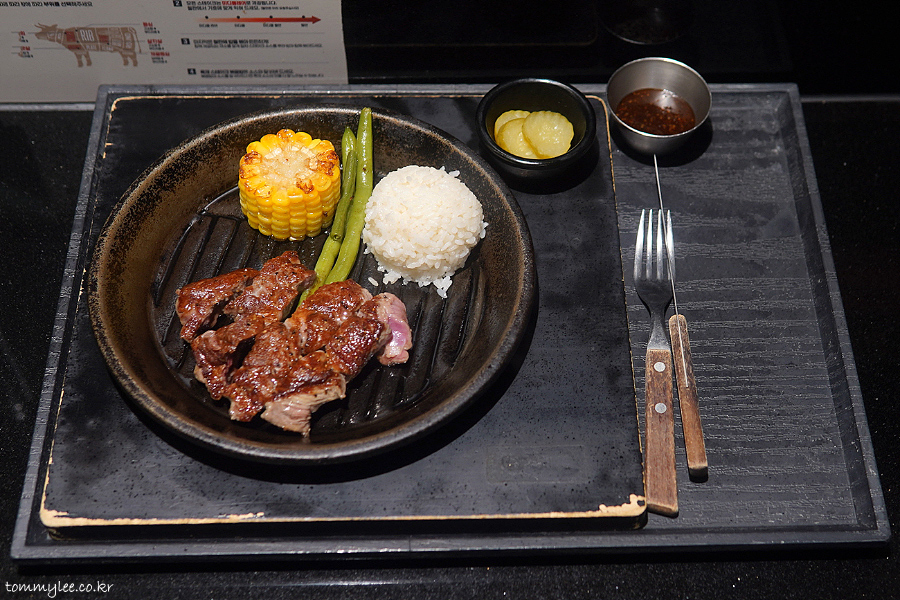 미디움 레어로 제공된단 안내와는 달리.. 실제론 미디엄 정도로 나오고 뜨거운 철판 위에서 더더더~ 익는답니다..