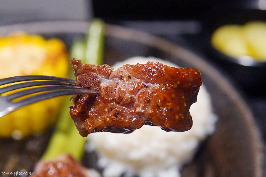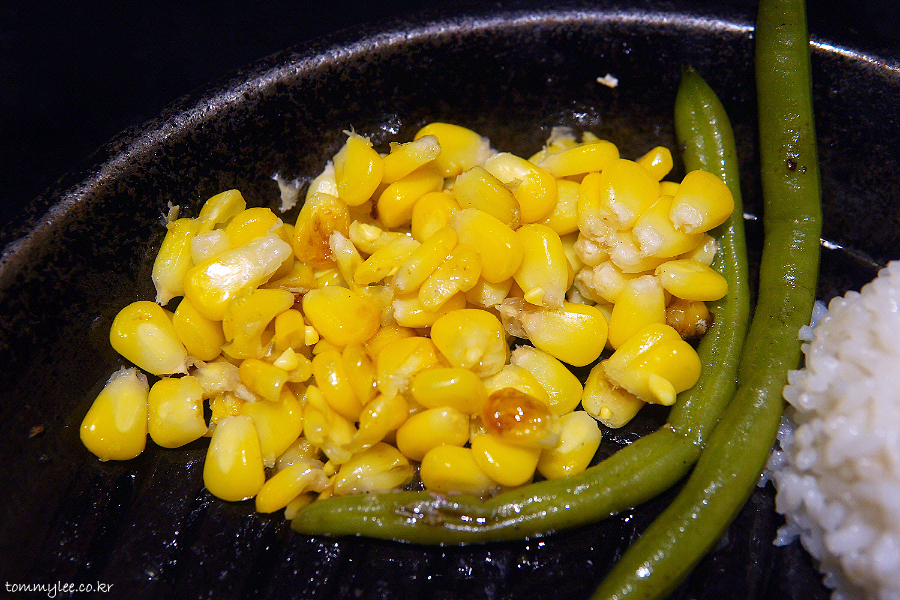 사이드로는 옥수수, 그린빈, 라이스 3종이 제공됩니다.. 고기만 달랑 나오는 거 아니고 나름 사이드도 알차게 제공..
