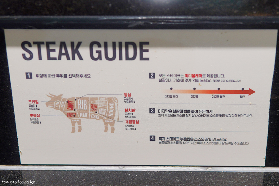 스테이크 가이드.. 1. 취향에 따라 부위를 선택해주세요.. 2. 모든 스테이크는 미이움레어로 제공됩니다.. 3. 마지막은 철판에 밥을 볶아 든든하게~.. 4. 특제 스테이크 볶음밥은 소스와 잘 비벼 드세요..
