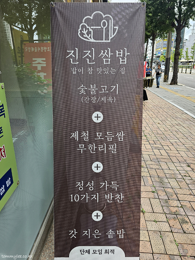 밥이 참 맛있는 집~ 진진쌈밥.. 숯불고기 + 제철모듬쌈 무한리필 + 정성가득 10가지 반찬 + 갓 지은 솥밥.. 이걸 다 준다고 쓰여있습니다..