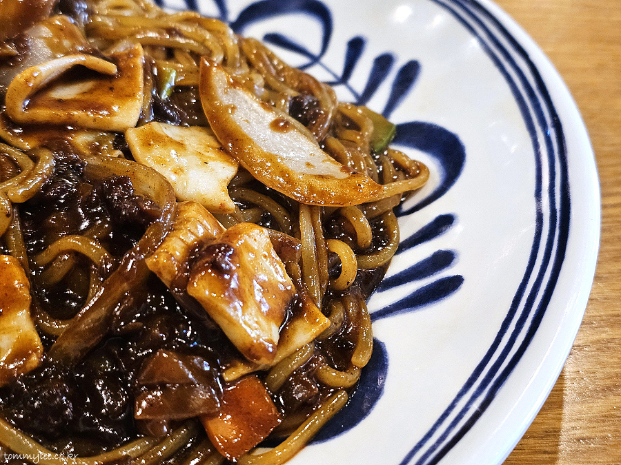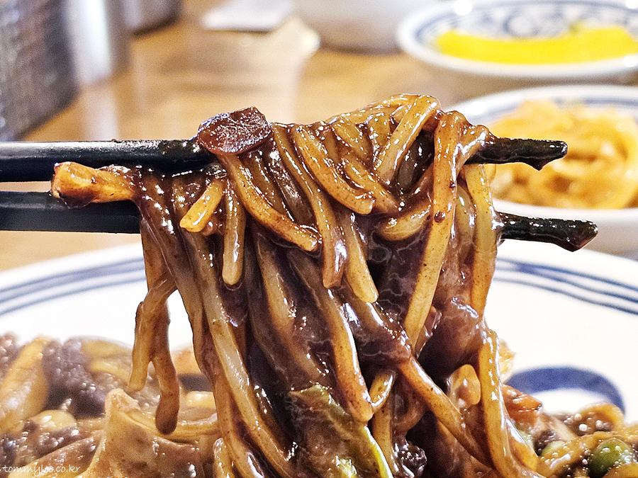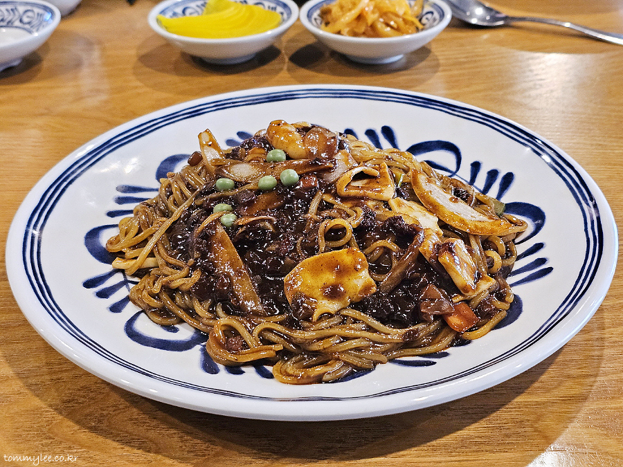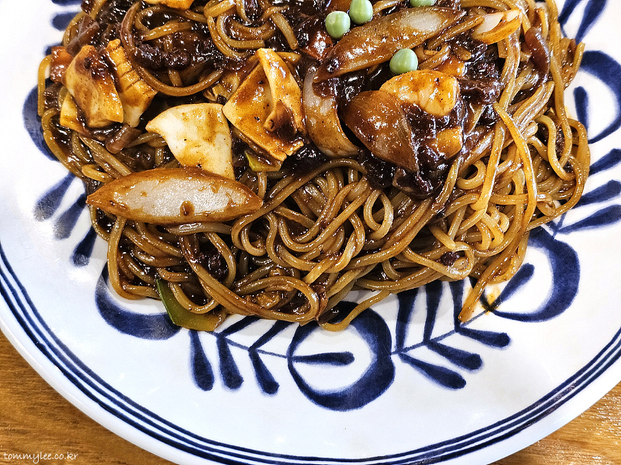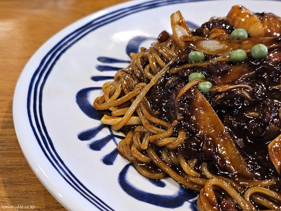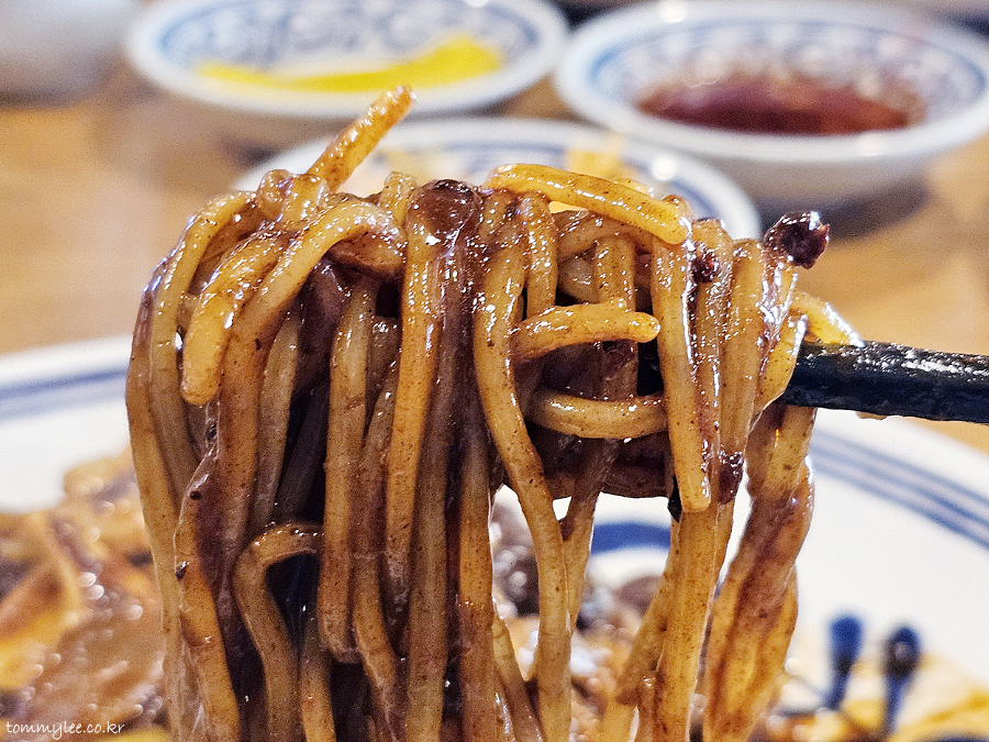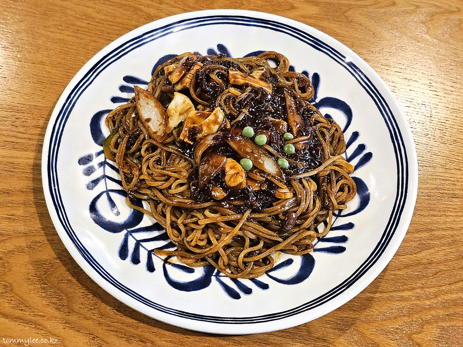 글로시한 기분의 까만 짜장소스의 클래식한 느낌의 쟁반짜장.. 비주얼이 꽤 괜찮고 맛나 보이는..