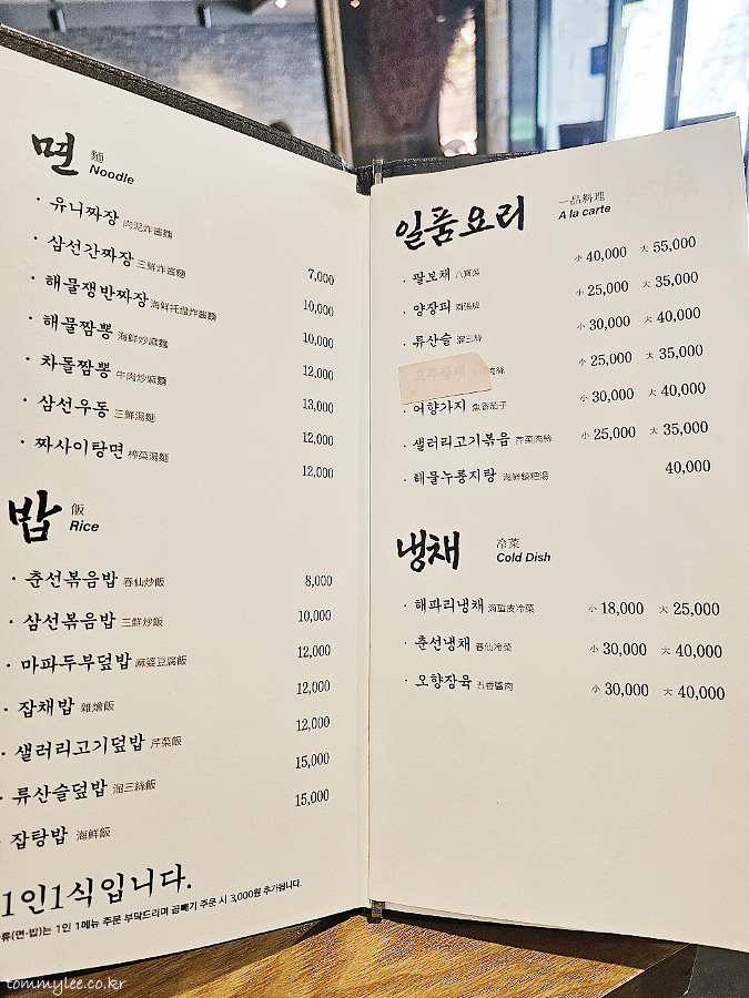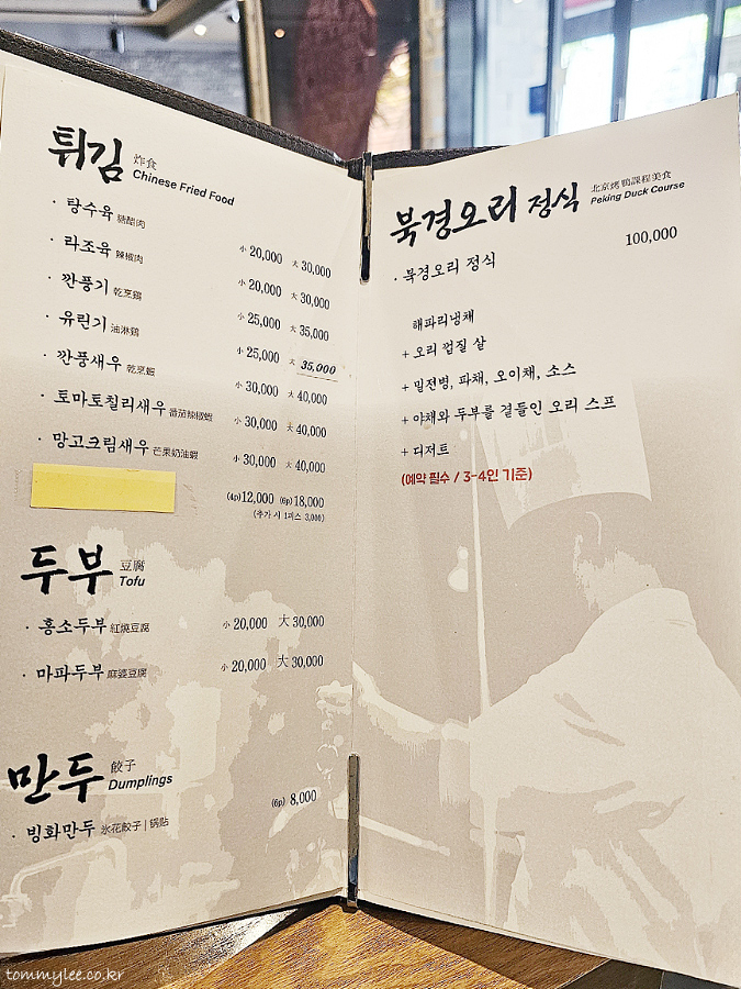 북경오리 정식은 당연히 예약제로 운영되고 가격은 3~4인 기준 10만원으로 저렴한 편.. 탕수육 20,000원, 라조육 20,000원, 멘보샤 12,000원으로 요리류 가격도 착함..