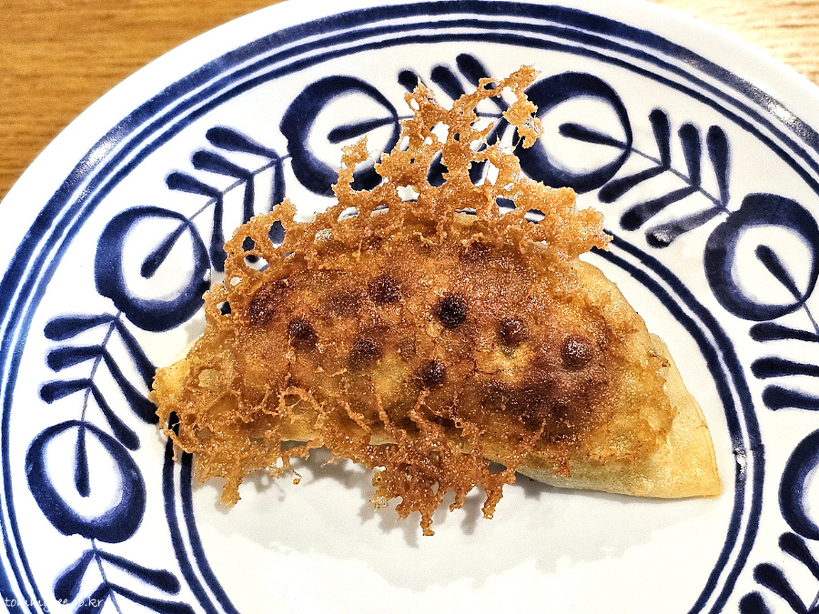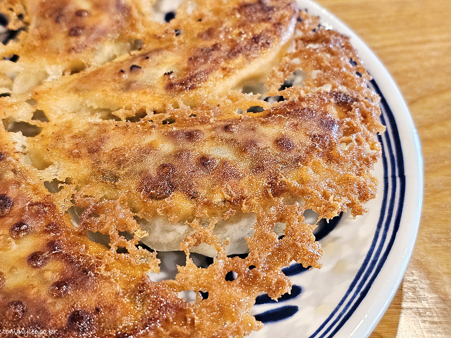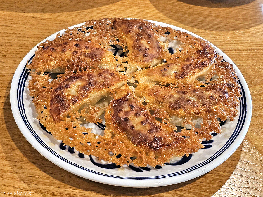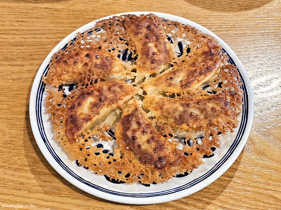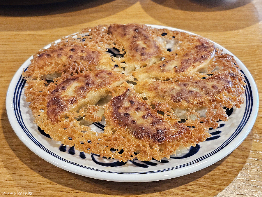만두 윗면에 전분물을 부어 얇은 막을 만들어.. 원형 접시 모양으로 붙어 있는 만두인데요.. 눈꽃처럼 생겼다고 해서 빙화만두라고 한다고 합니다.. 우리나라에선 이런 군만두를 하는 집이 많지는 않은데.. 군만두에 환장하는 일본에서는 꽤 대중적인 형태랍니다..
