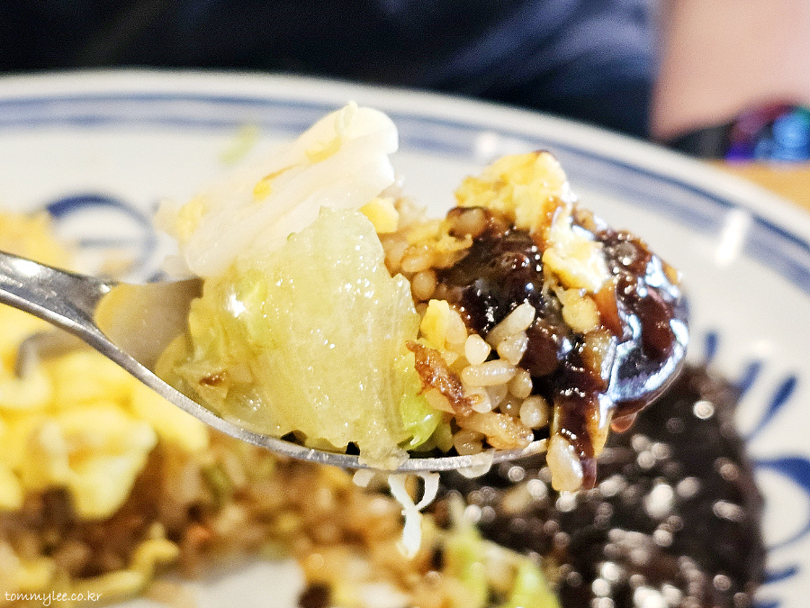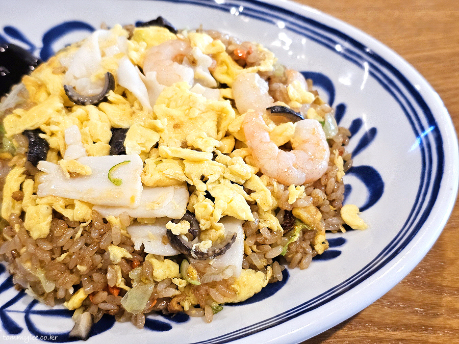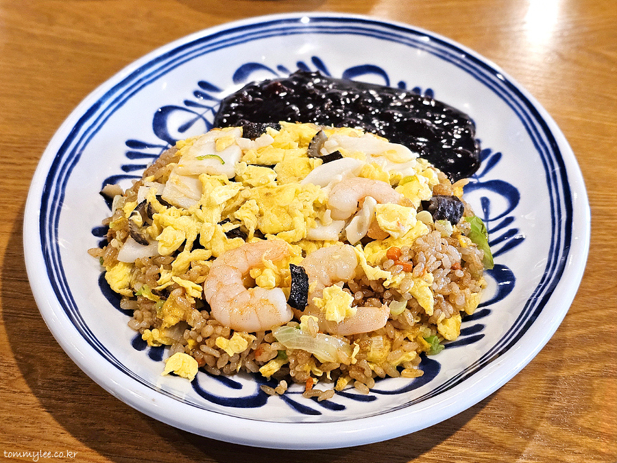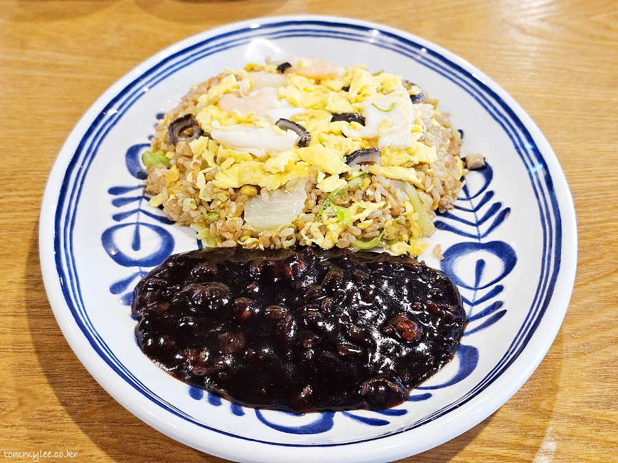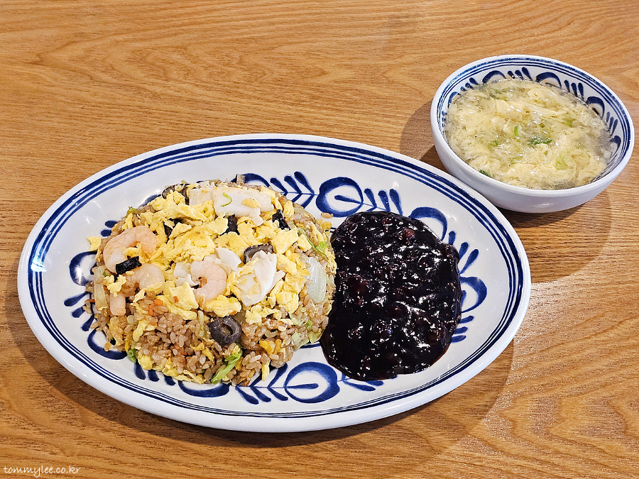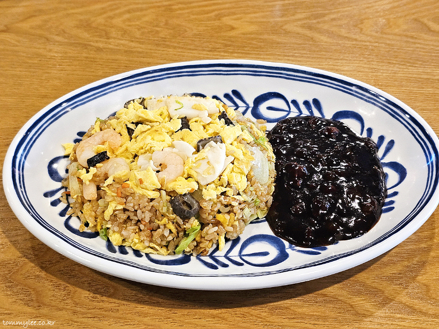 까만 짜장소스와 함께 나오는 해물이 많이 들어간 계란 볶음밥이네요..