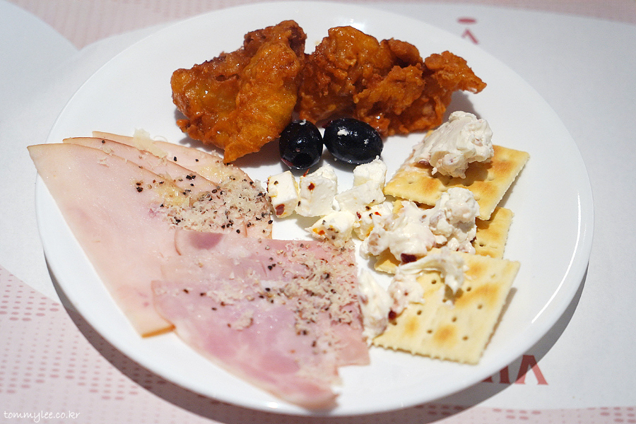 지인분께서도 샤퀴테리존을 공략하셨더란.. 포크햄, 치킨햄 2종에, 페타치즈, 블랙올리브, 크림치즈 카나페에 후라이드 치킨을 또 가져오신..