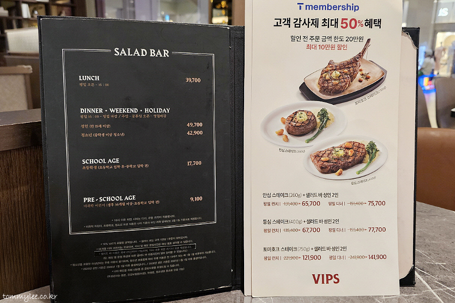 빕스 샐러드바 가격.. 런치 39,700원, 디너, 주말, 공휴일 49,700원.. 청소년 디너 42,900원, 초등학생 17,700원, 미취학아동 9,100원.. 메뉴판에도 T멤버십 고객감사제 관련 안내가 있었고요..
