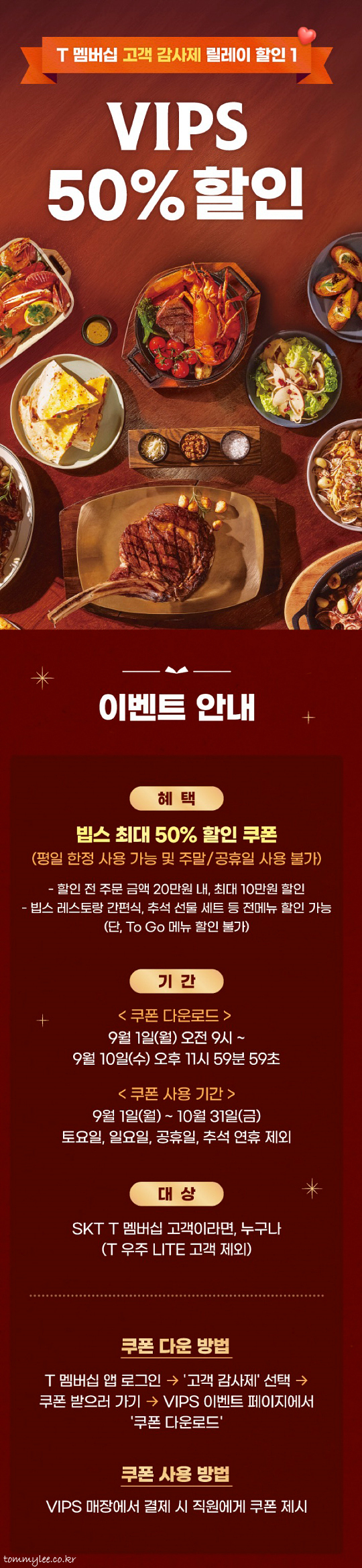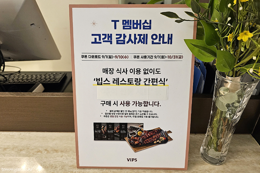 T멤버십 고객감사제 9월 릴레이 할인 1탄으로 준비된 게 빕스였는데요.. 평일 한정이긴 하지만 50%할인이고 최대 20만원까지 할인 적용, 쿠폰 유효기간마저 10월말까지로 길어 엄청 좋은 내용이었답니다.. 고객감사제 빕스 쿠폰을 9월10일까지 다운로드를 하는 게 중요했죠.. 무조건 기간 내 받으셔야 함.. 저는 지인분 쿠폰에 그냥 따라가기만 하면 되었던지라 넘 편안했네요..
