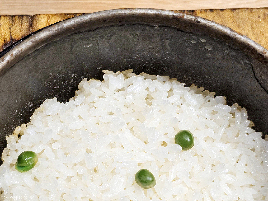 완두콩이 올려진 따끈한 솥밥의 모습.. 뭐랄까 옛날 외갓집 가서 먹던 그 솥밥 느낌 나요.. ㅋㅋㅋ..
