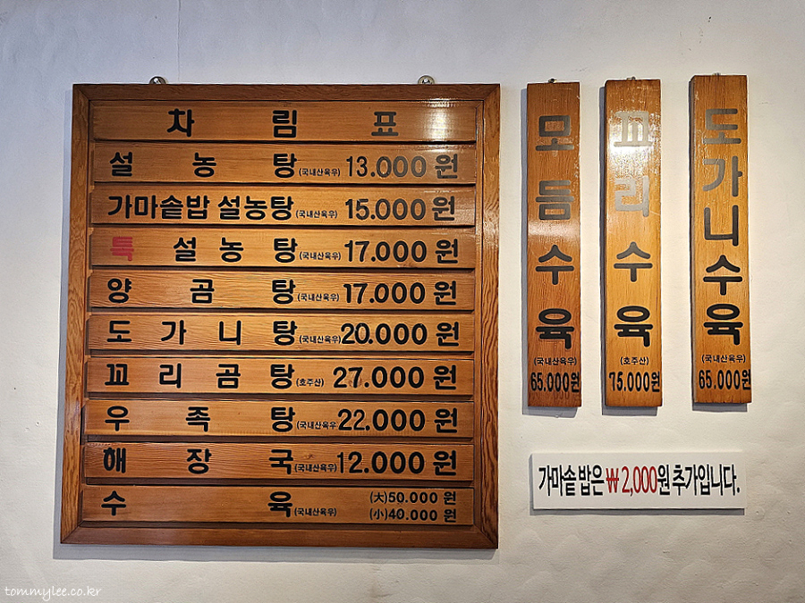 모래내설농탕 메뉴 및 가격.. 설농탕 13,000원, 가마솥밥 설농탕 15,000원, 특설농탕 17,000원, 양곰탕 17,000원, 도가니탕 20,000원, 꼬리곰탕 27,000원, 우족탕 22,000원, 해장국 12,000원 / 수육 대 50,000원 소 40,000원, 모듬수육 65,000원, 꼬리수육 75,000원, 도가니수육 65,000원..