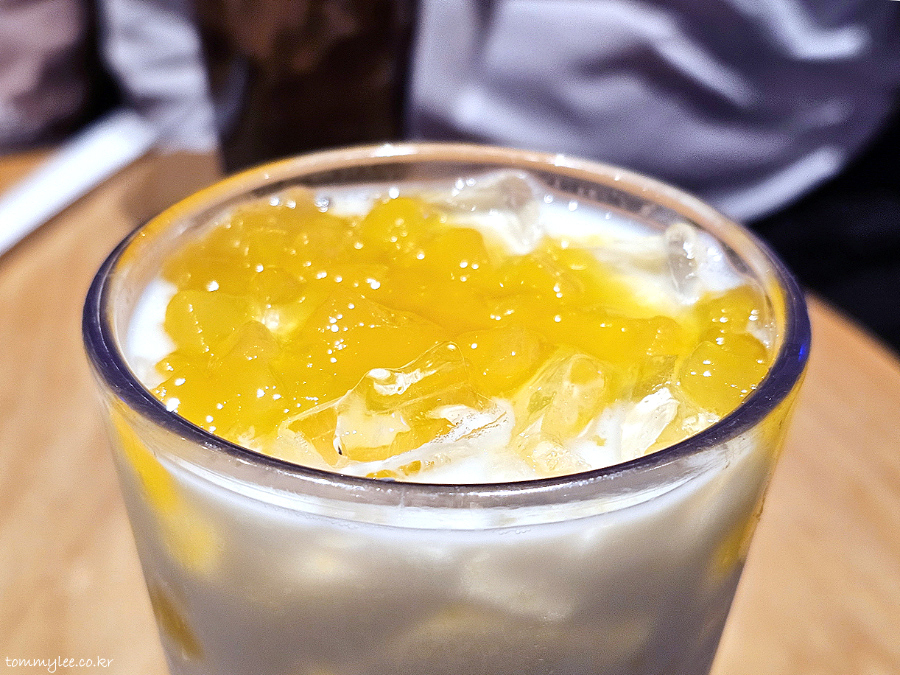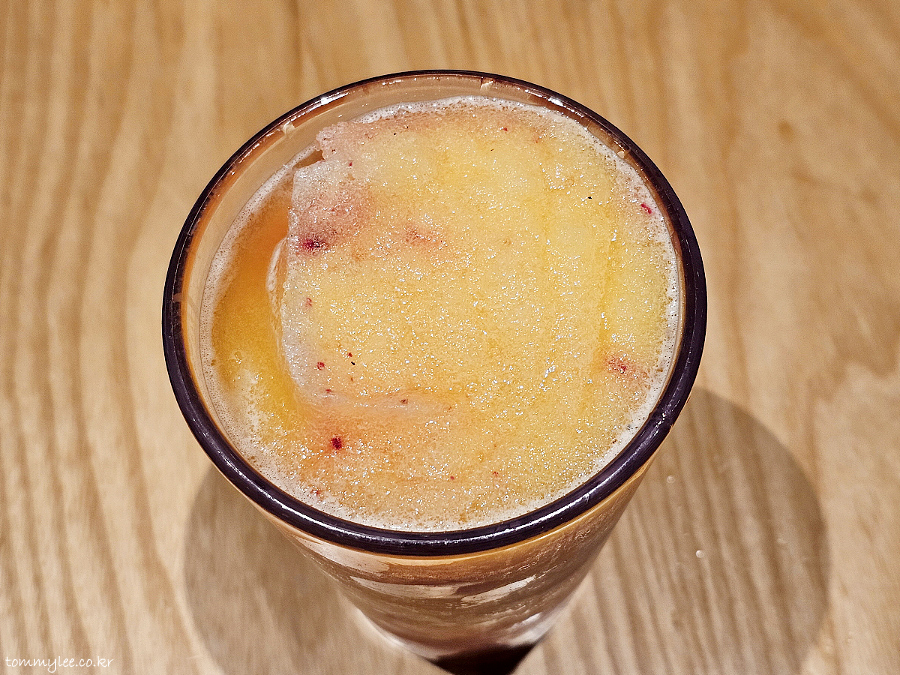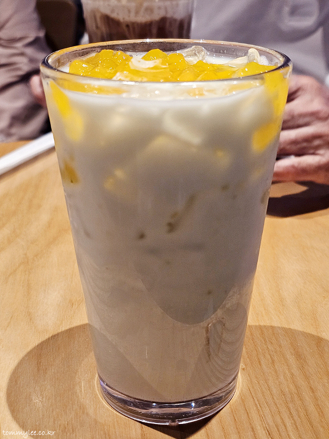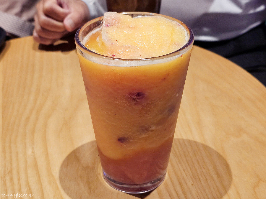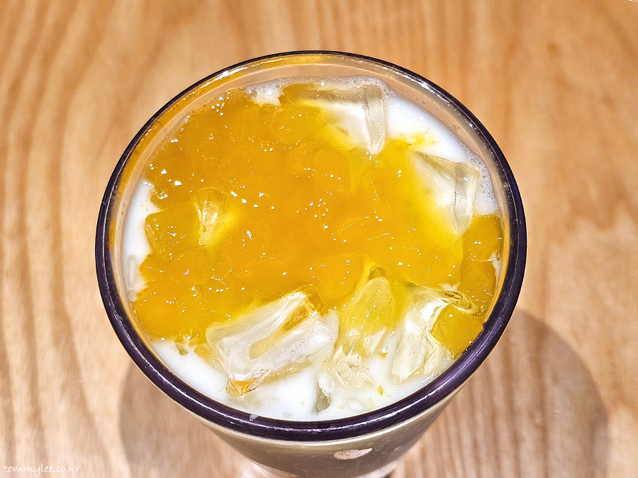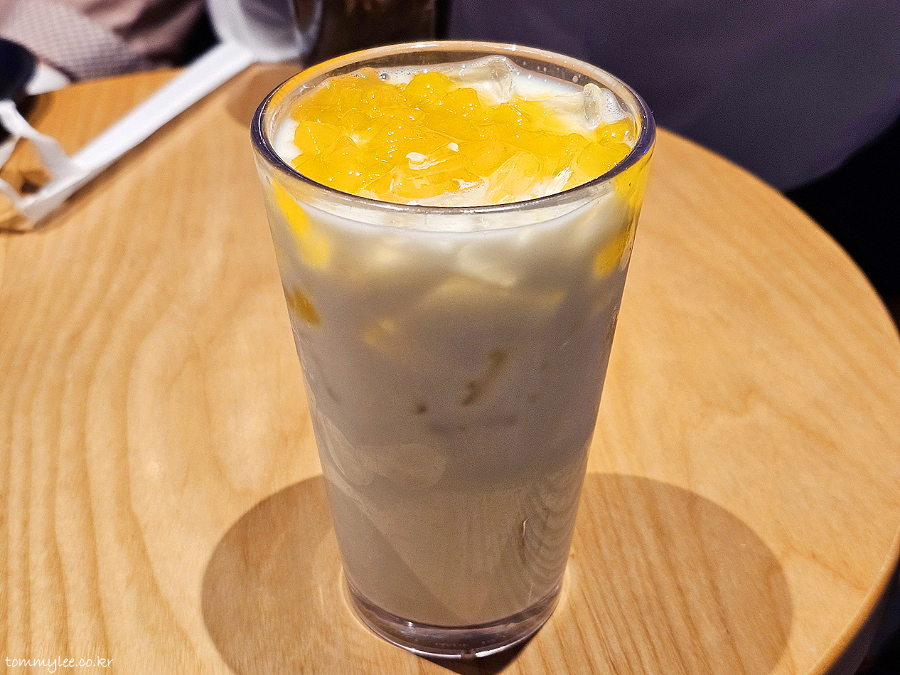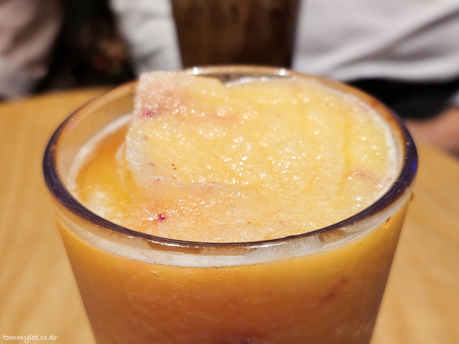 망고 주스와 피치 베이스에 피치 청크에 망고 용과 토핑이 들어가는 과일계 블렌디드 음료.. 카페인 없고 우유가 안 들어가 유당에서도 자유롭기 때문에 지인분께서 매우 선호하신답니다..