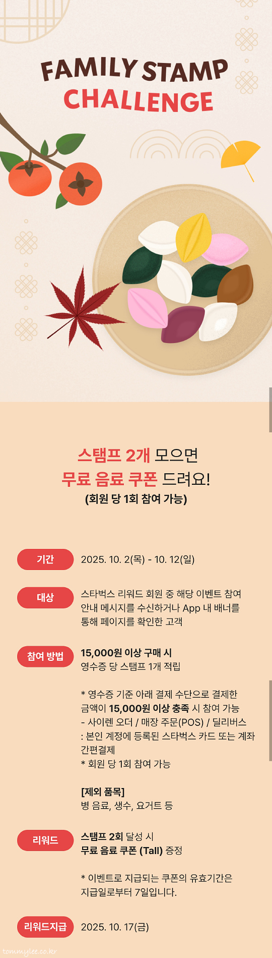 추석 연휴기간에 스타벅스에서 패밀리 스탬프 챌린지 이벤트가 있어서 스타벅스를 찾게 되었답니다.. 송편 스탬프 2개를 모으면 무료 음료 쿠폰을 주는 훈훈한 추석 행사..
