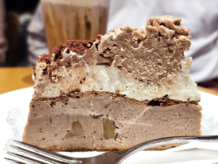 마롱 치즈케이크 위에 생크림과 마롱 크림을 돔 모양으로 차곡차곡 쌓아 올린 형태로 보시면 될 듯합니다..