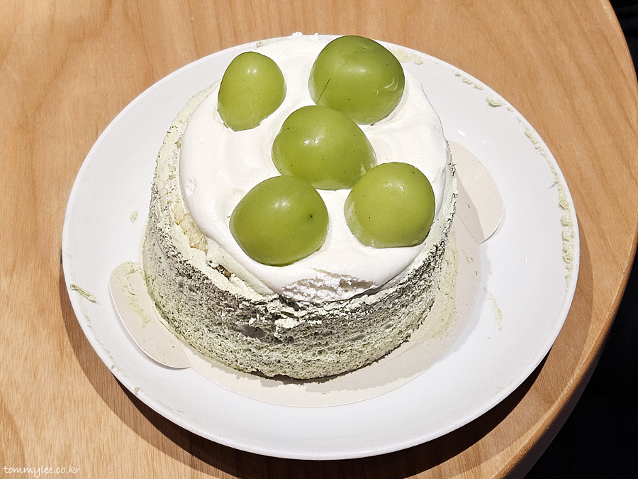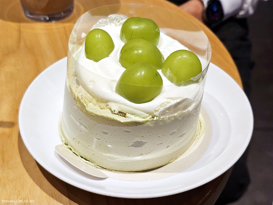 샤인머스캣 생크림에 화이트 생크림 조합으로 보시면 될 듯하고요.. 큼직한 샤인머스캣 토핑이 5개 올라간답니다.. 샤인머스캣 포도알이 엄청 커요..