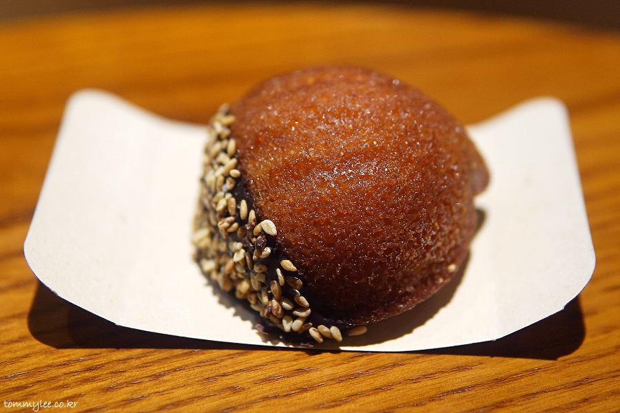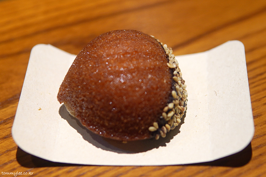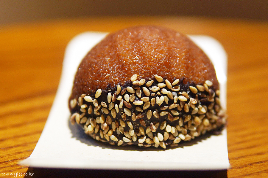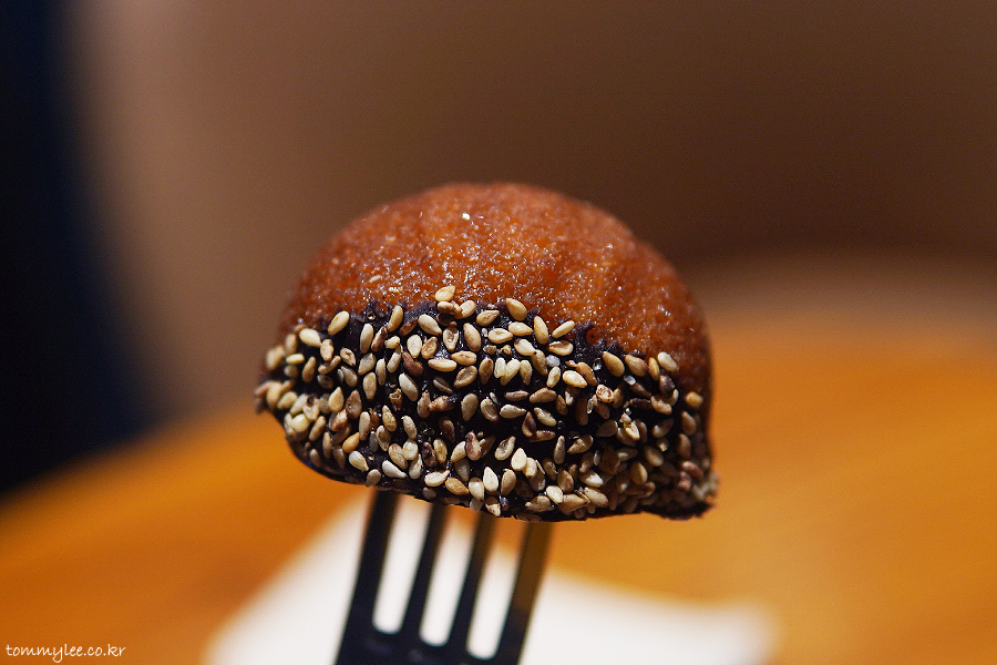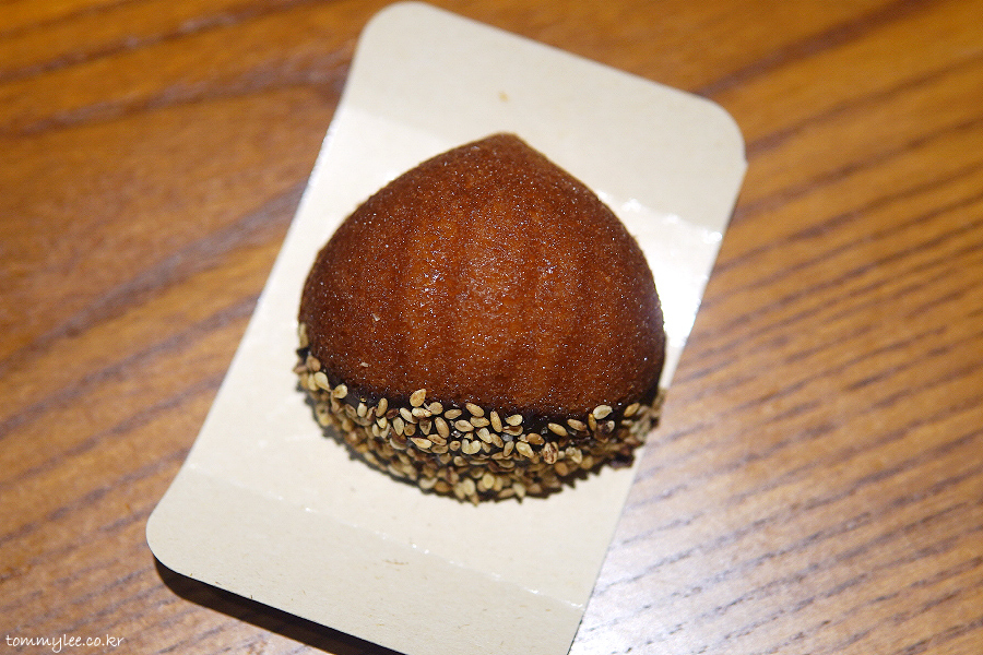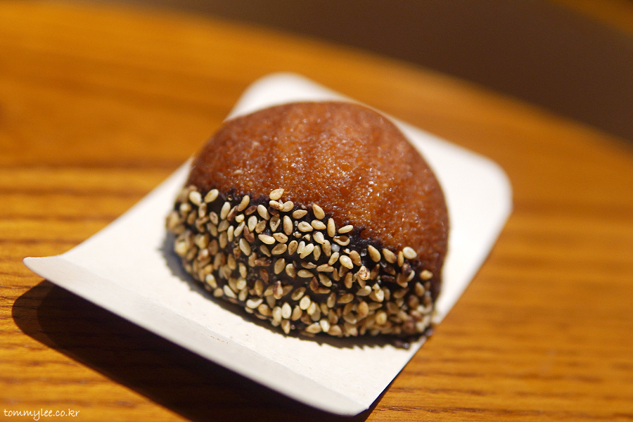 마롱 마들렌을 위에서 바라보면 이런 느낌.. 참깨와 초콜릿 코팅으로 밤스러움을 제대로 연출했어요..