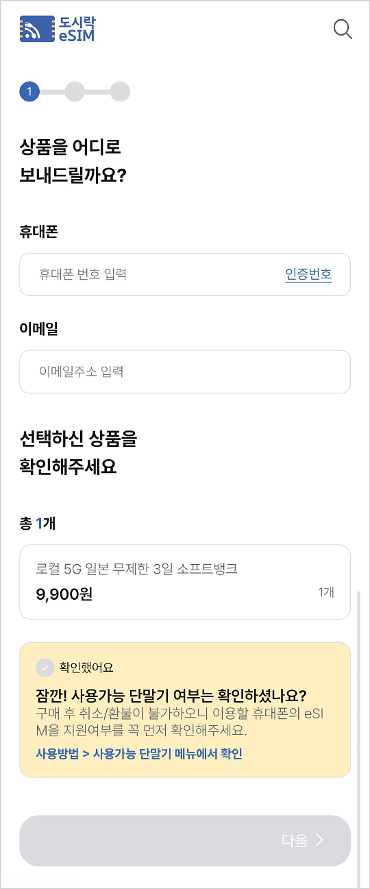 도시락 eSIM은 휴대폰 번호만 입력하면 끝.. 수령이나 반납 절차가 필요없기 때문에 엄청 간단하답니다.. 데이터가 무제한인지, 통신사와 유효기간을 확인 후에 구매하기 버튼을 누르시는 게 중요합니다..