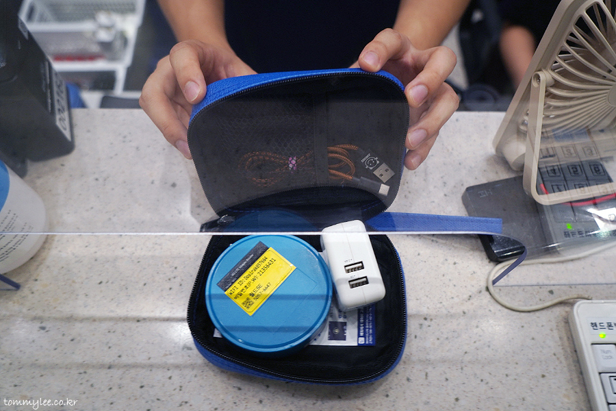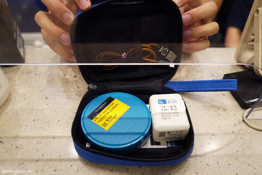 와이파이도시락 파우치에 포켓와이파이 단말기, 충전기, 케이블 이렇게 3가지가 다 들어 있는지 현장 확인 중..