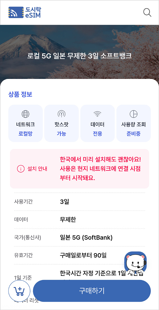 국가 선택 후 사용기간을 선택하면 이용일에 맞는 일본에서 이용가능한 이심 플랜이 주르르 뜨는데요.. 저는 로컬 5G 일본 무제한 소프트뱅크 플랜, 로컬 일본 무제한 KDDI 플랜을 추천합니다.. 이심은 특히나 무제한 플랜이 필수..