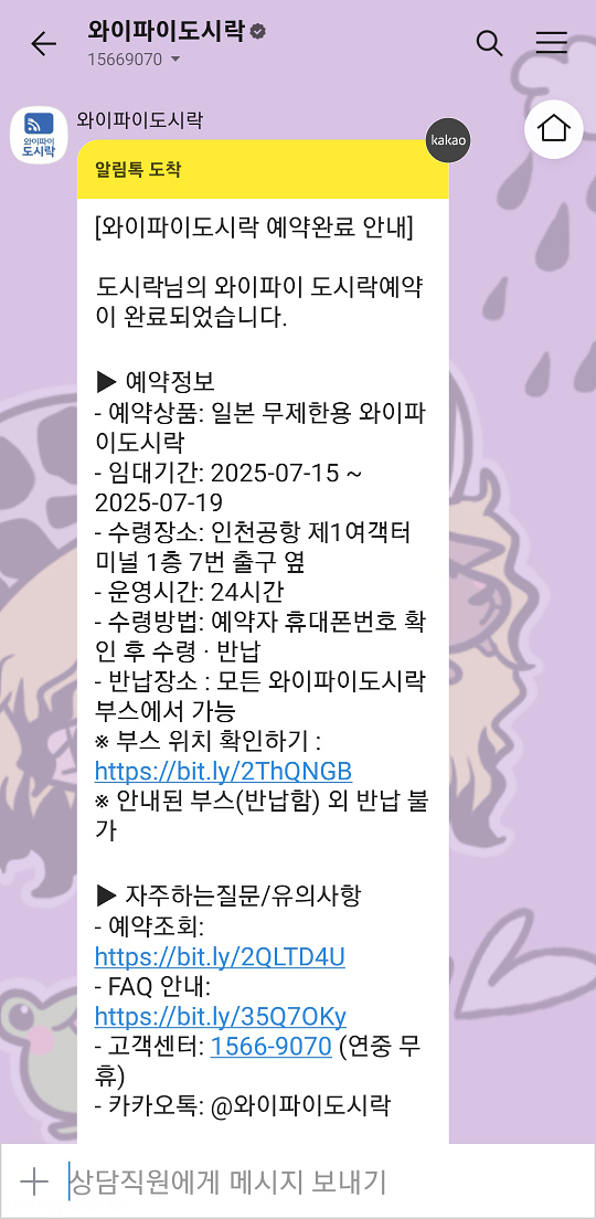 예약완료 시 와이파이 도시락에서 카카오톡 알림톡이 오는 지 확인 필수이고요..