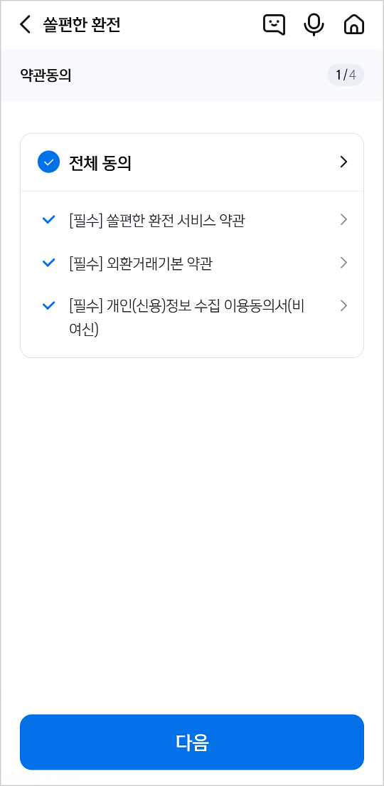 환전하기 버튼을 누르면.. 가장 먼저 약관에 동의하라는 내용이 뜹니다.. 쏠 편한 환전 필수 약관에 동의한 후 다음으로..