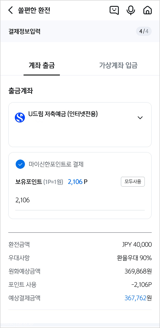저는 신한은행 계좌가 있어서 계좌출금을 선택했습니다.. 신한 쏠편한 환전은 마이신한포인트 사용도 가능해서 소소하지만 포인트 사용했습니다.. 이건 좋네요..